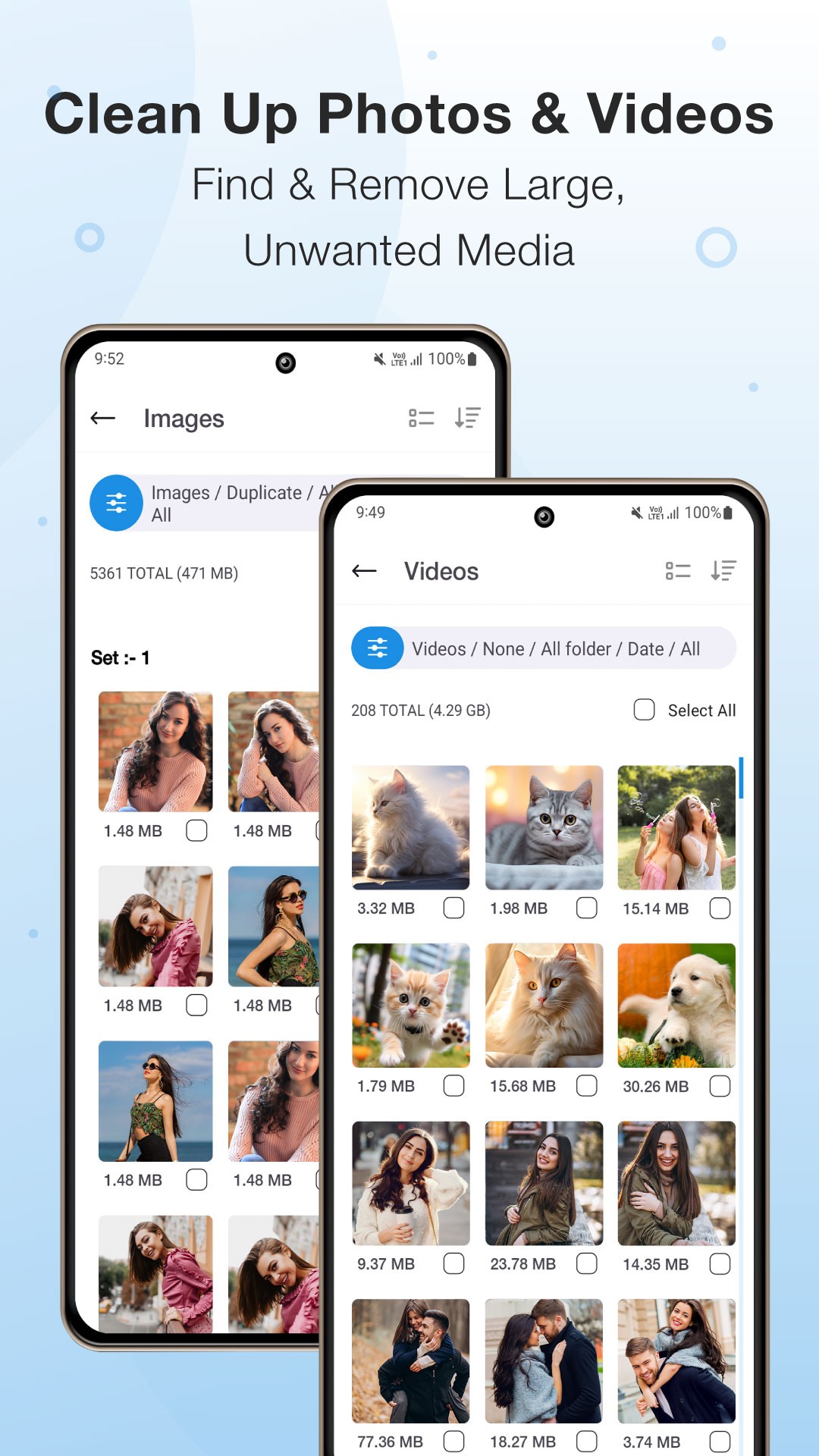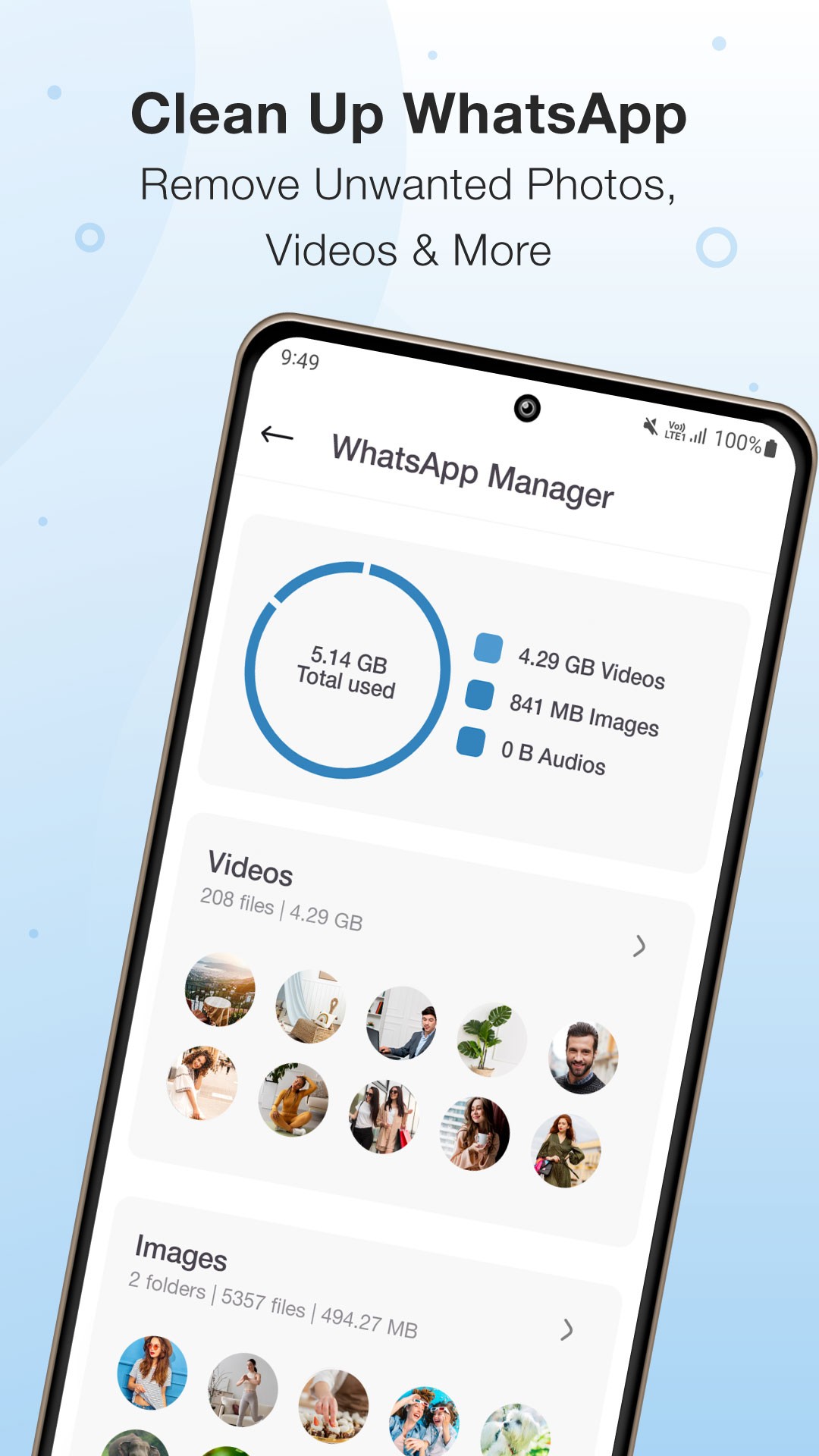 WhatsApp Cleanup: Free up space by removing unwanted photos, videos, and documents from WhatsApp.
