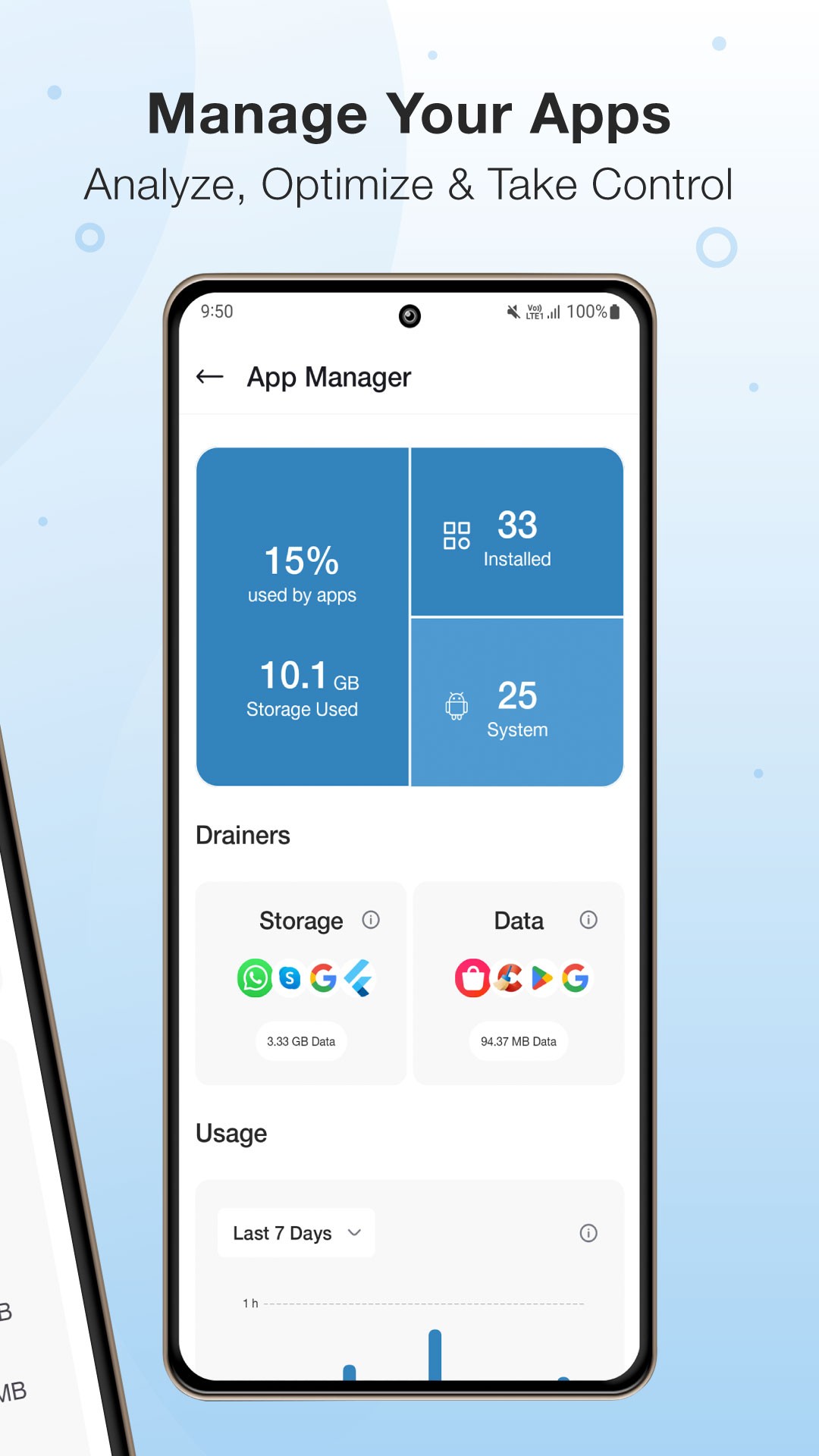 App Usage Tracker: See which apps are using the most storage or data for better device management.