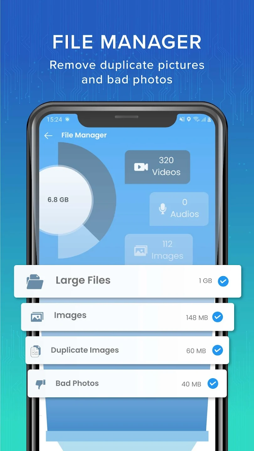 File manager feature will allow user to remove bad pictures, duplicate photos, large files, etc to manage and free up space by getting rid of the unnecessary files.