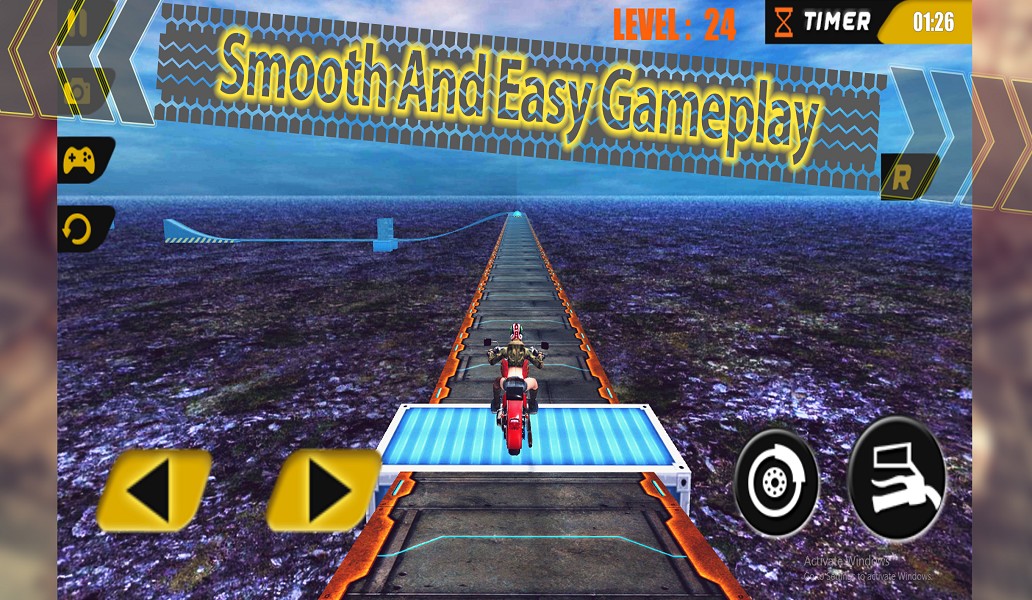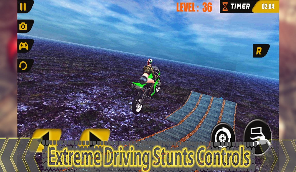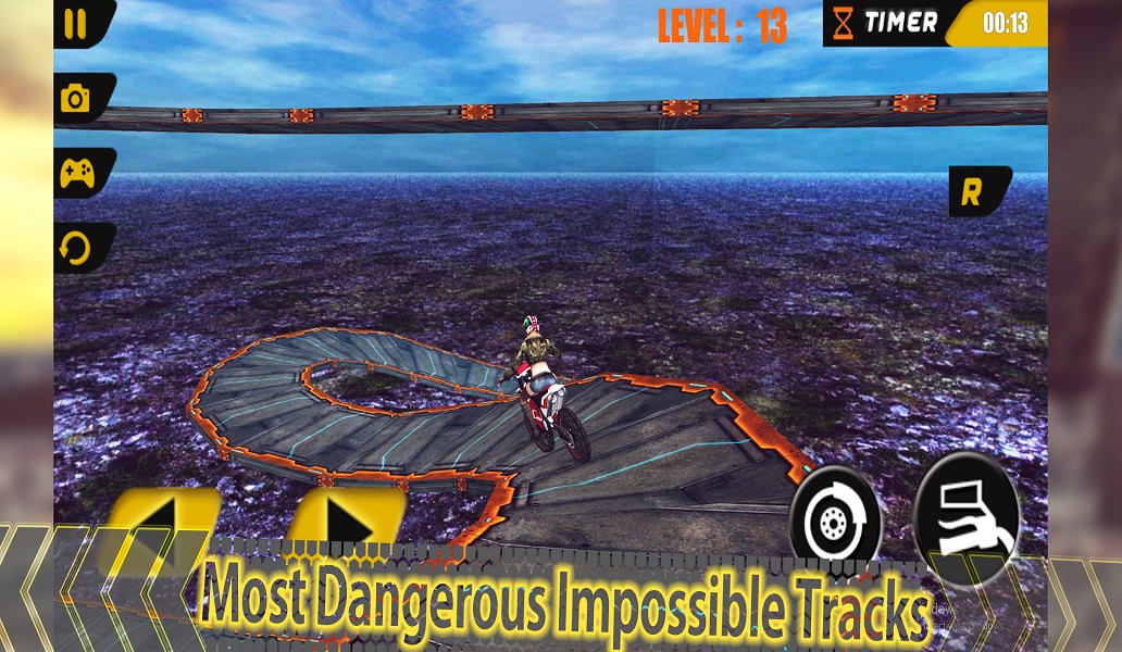 It’s time to action on the moto bike. Fantastic & extremely adventurous on two-wheel simulator on the sky bike riding game. Be safe self. Many motorbike are available in store you can unlock your favorite riding bike for showing stunt. Drive your extreme dirt in the bike stunting game is to challenge your skills to prove on dangerous sky tracks because other simulators are many on the road. Extreme Bike Impossible Tracks makes a full real professional stunt traffic rider. When you start press the race button then the speed pedal motto bike is go for fast riding bike speed control your hand and bike level when need slow motor bike speed press brake the bike stunt speed go very down.