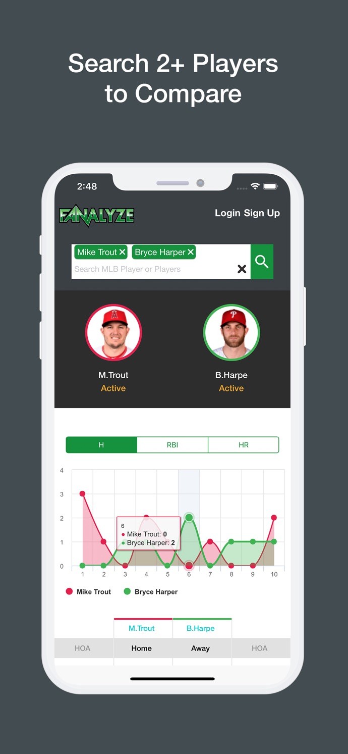 SEARCH 2 or more NFL football or MLB baseball players to get a side by side analysis with weekly graphs to view trends, season stats and exclusive stats to help you start the best player for each week.