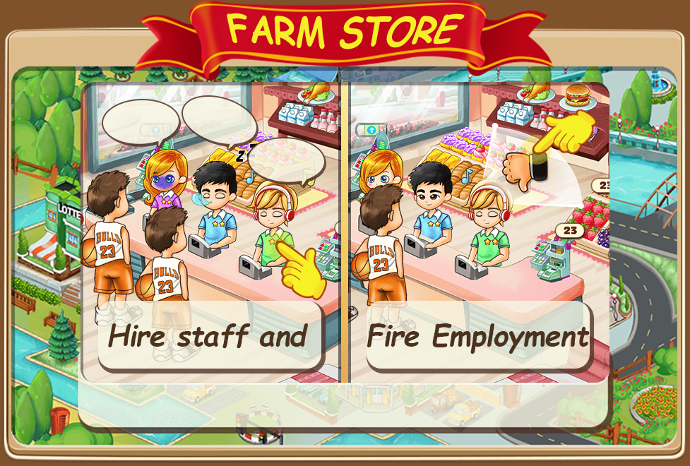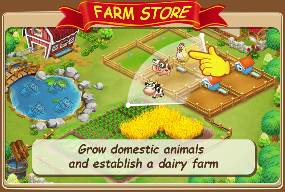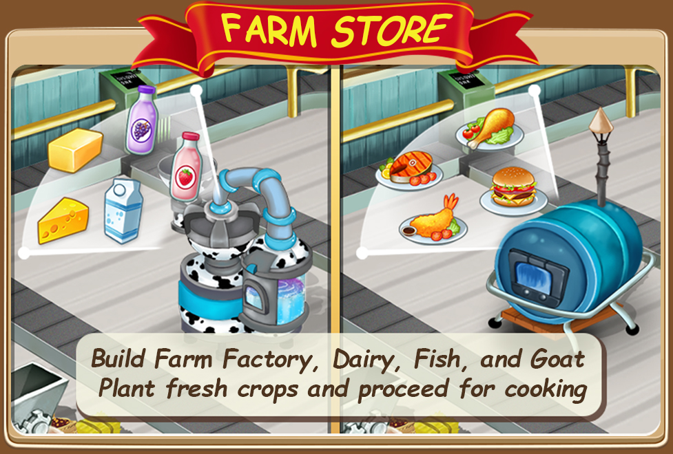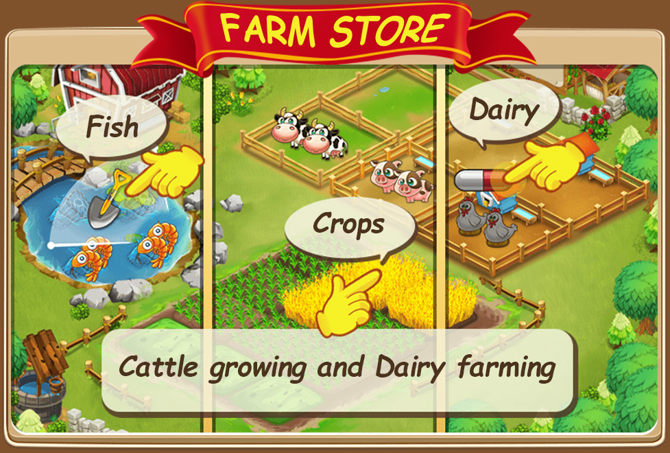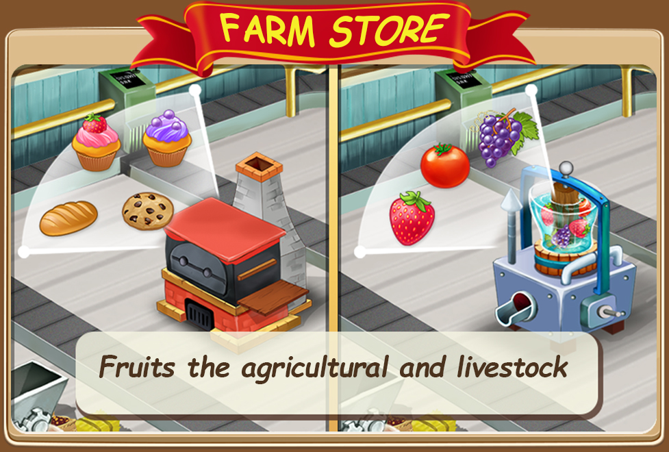 You can buy new buildings, new business in the town. In your green farm you plant wheat or fruits, feed farm animals like cow. Collecting milk, harvesting the plants, bring crops to the factory to produce fish grill, cheese, bread or strawberry pie. You need a staff for the store. Hire staff and supply more farm products to make your customers satisfied.