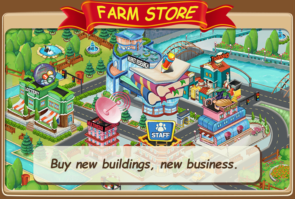 At the upper levels of this farming game, you can own the whole town by buying supermarkets, research company, techno and more. You even hire market research specialists, give ads through multimedia. Isn't it like a real farm Store?