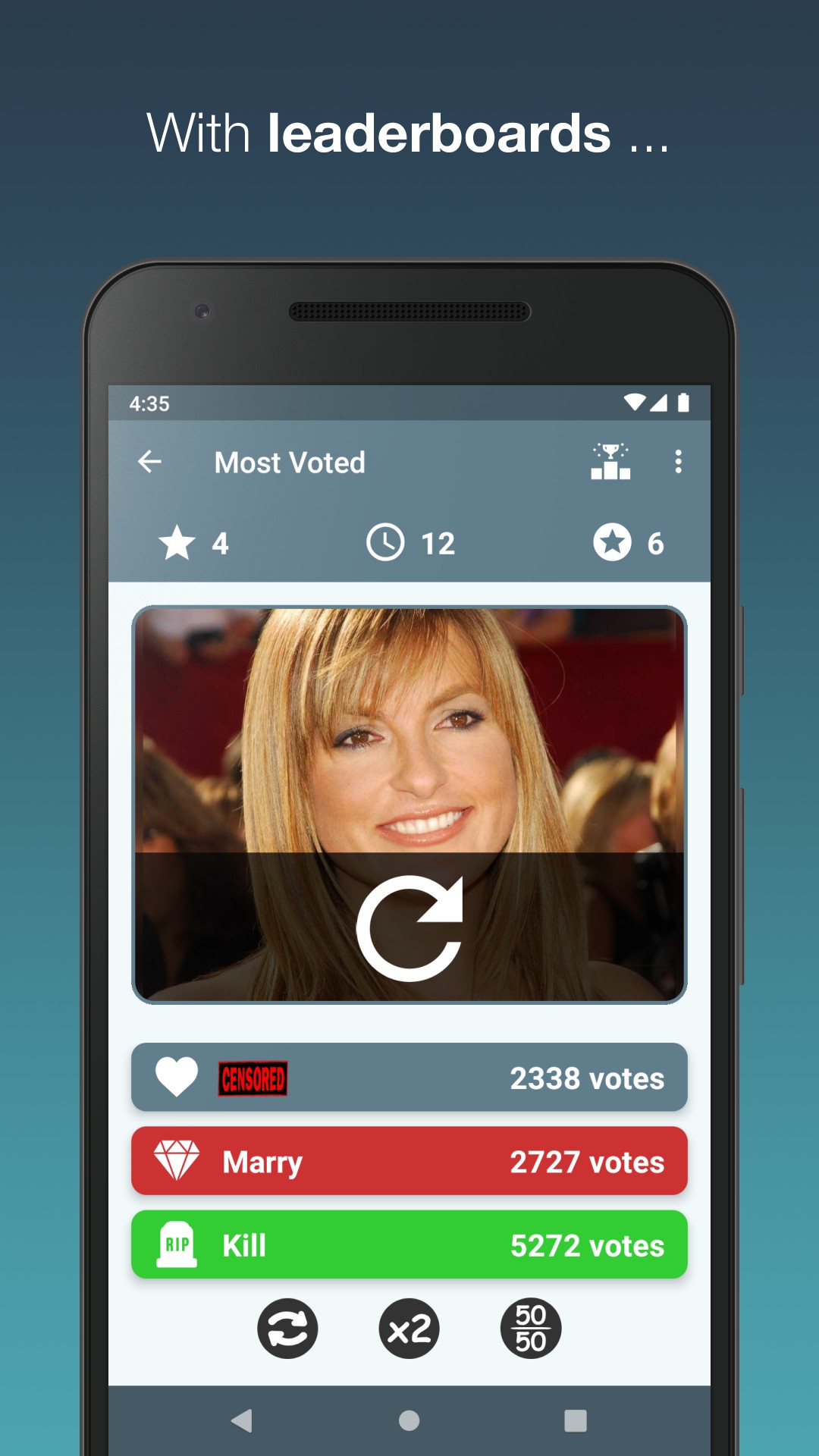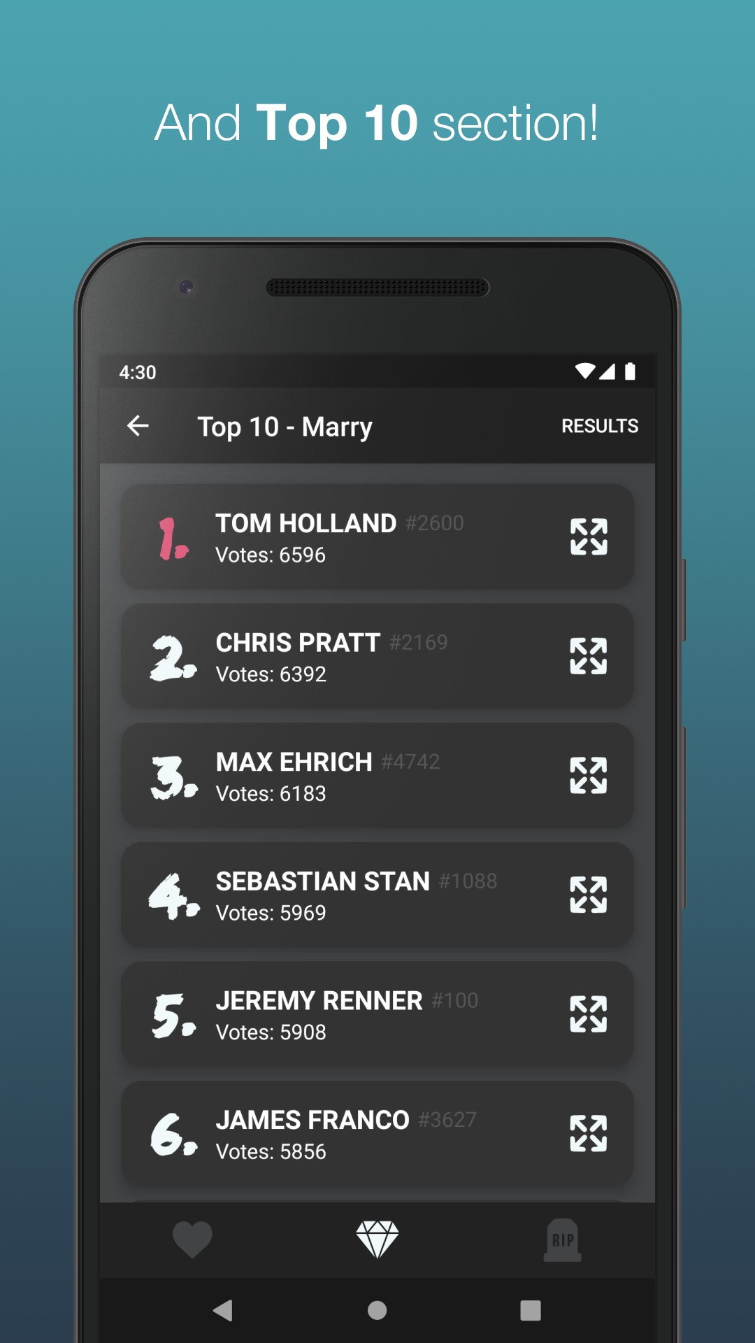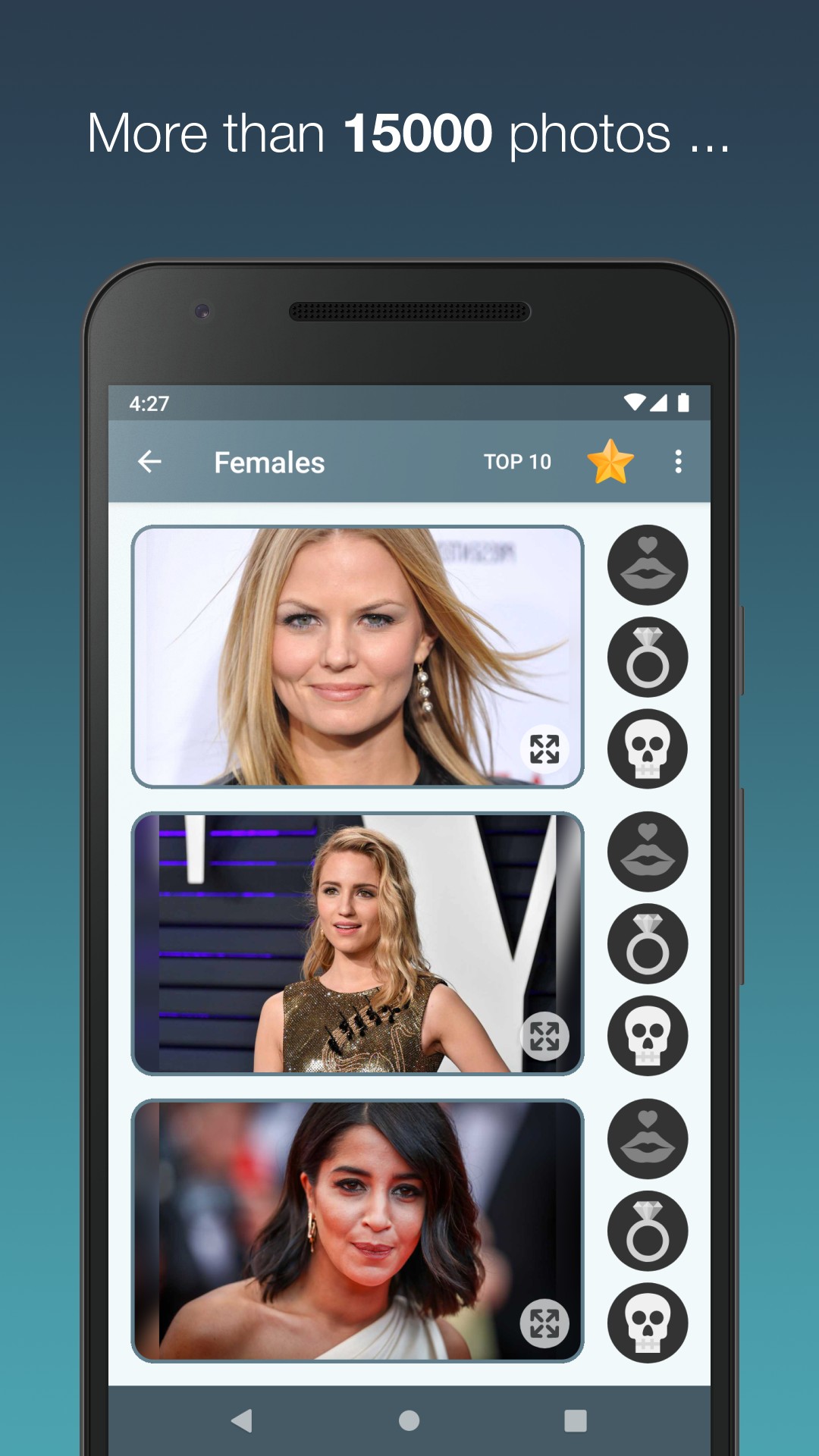 The app includes more than 12000 photos and counting. New photos are added regularly. You can also visit the Top 10 lists for all categories (F, Marry or Kill) and check the current standings.