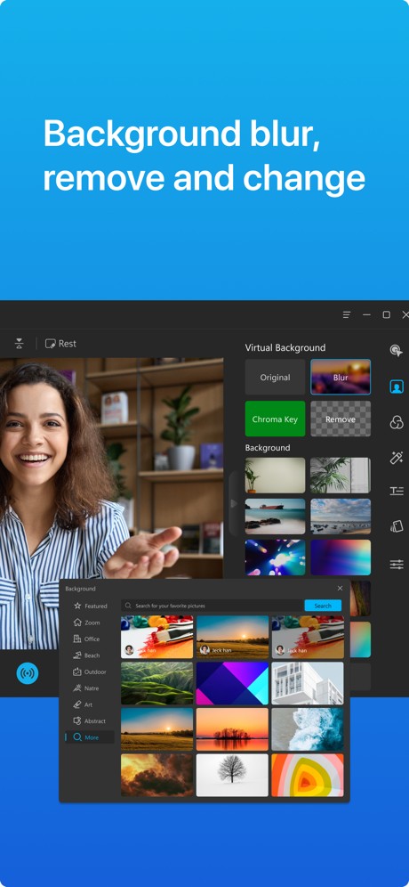 - Background, Effects, and Filters: Remove, blur, and change webcam background. Chroma Key. Mosaic. Video Background, etc.