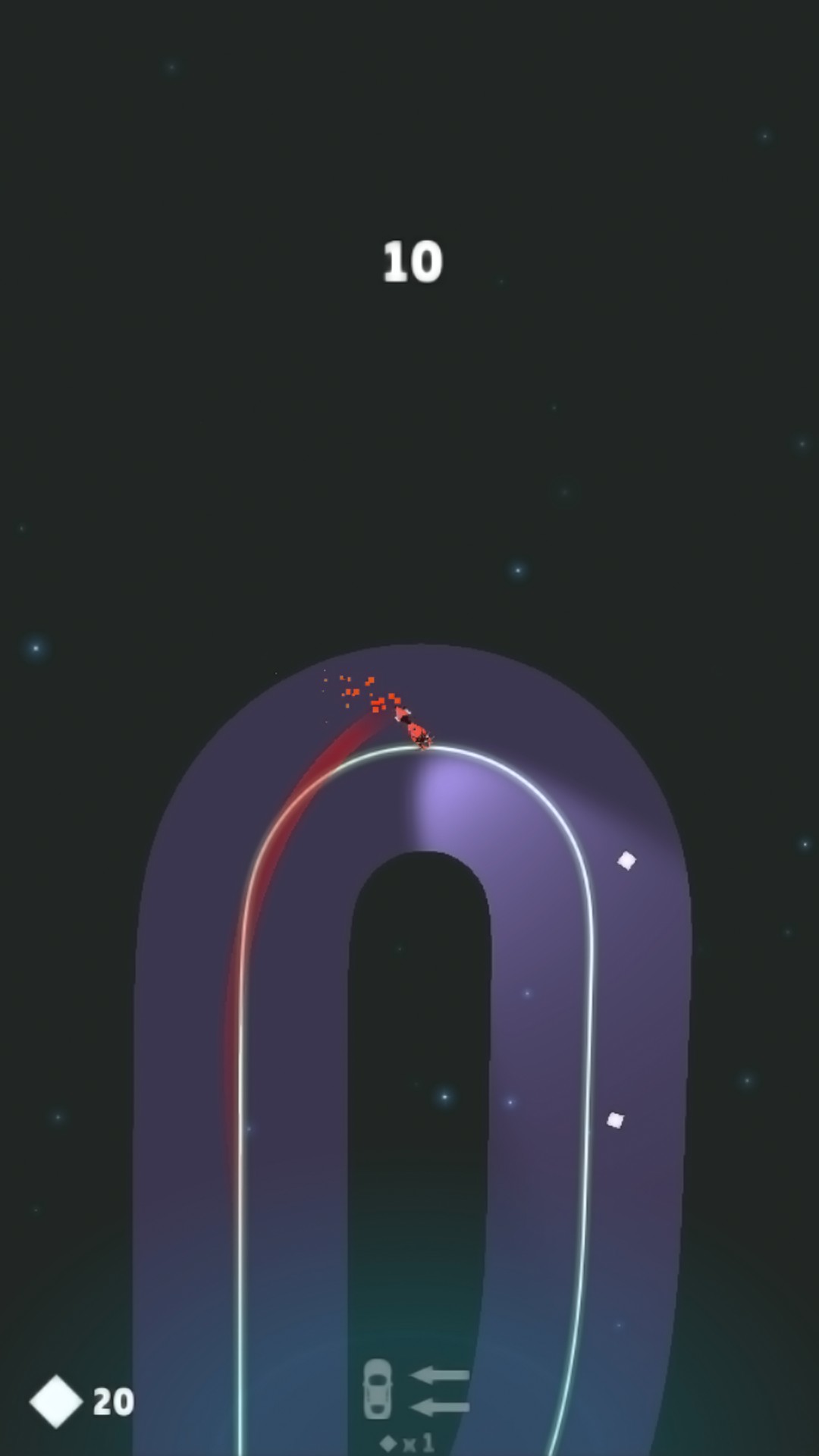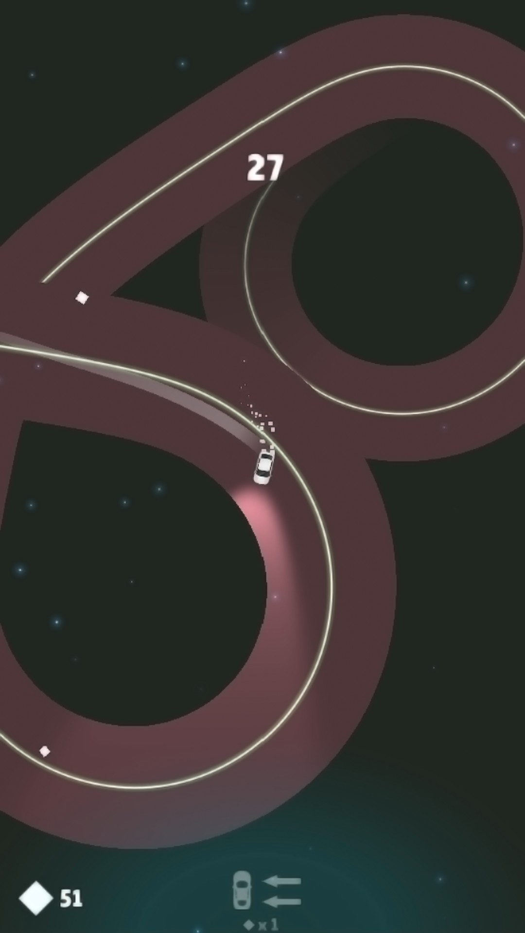 Finger drift - Turn right only right turn, ahead of the turn, click fingers to click on the screen to drive the car into the curve. Pay attention to the angle and drifting force when the car is out of the curve. Because only the right turn, so straight line road difficulty increases, in straight road can consume diamonds slightly adjust the direction of drift.