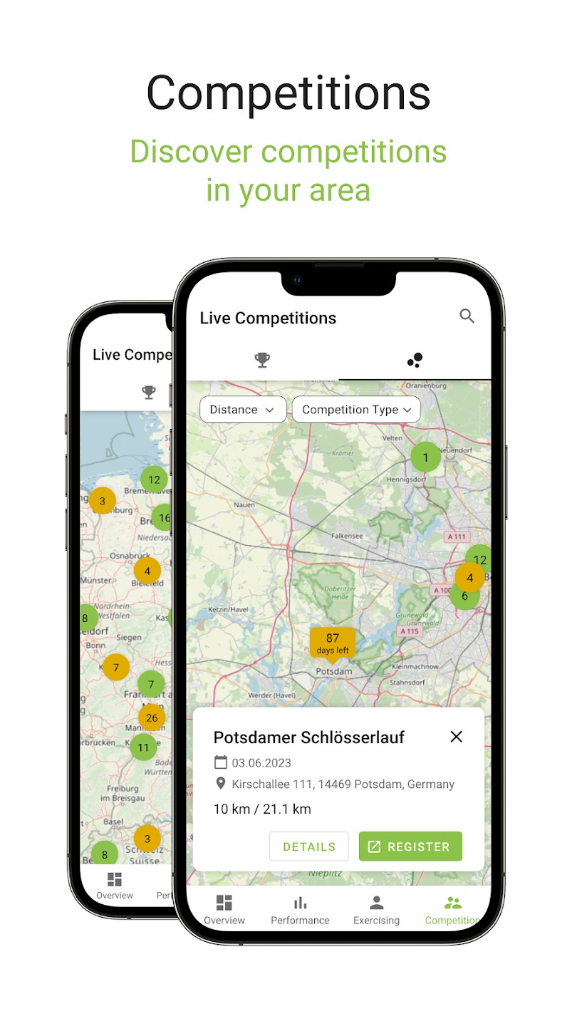 • Live and Virtual Competitions and Events: Experience the thrill of real-time virtual AI fitness events or at live events with our live running calendar. View and join competitions in your area on the interactive map, so you have the global fitness community at your fingertips.