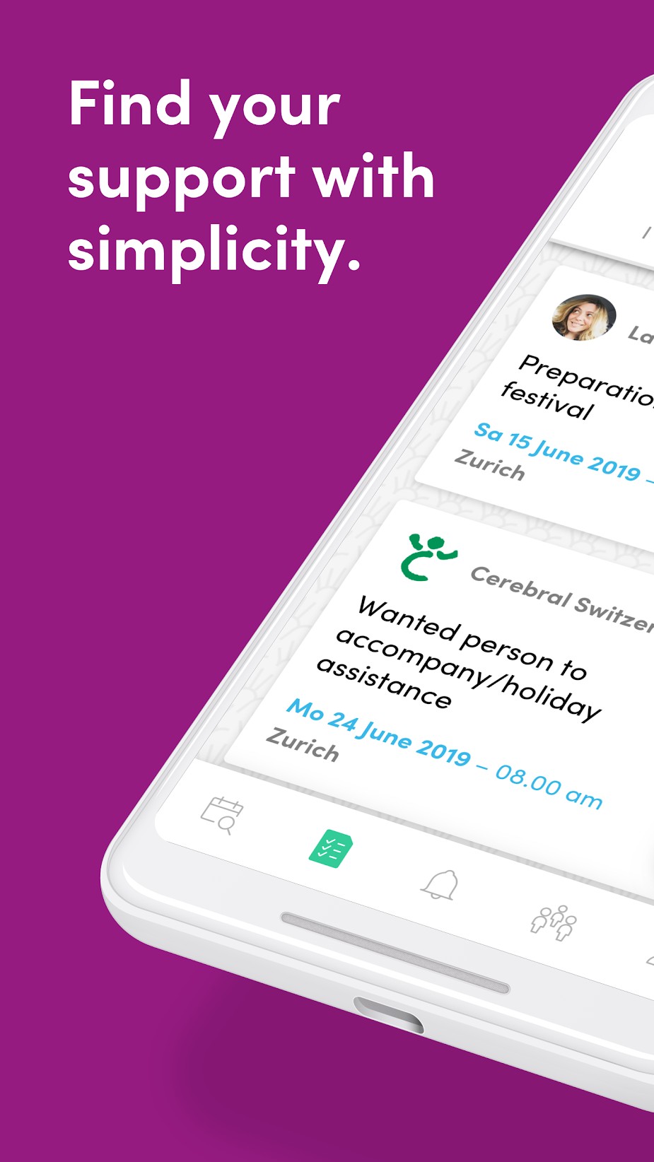 Push messages inform the people in your network when there is a new need – a helping hand is found in an instant. In this way, everyone stays up to date and in touch with each other. Being it at home, in your club or at work - with «Five up» organizing support becomes easier than ever before.