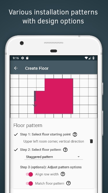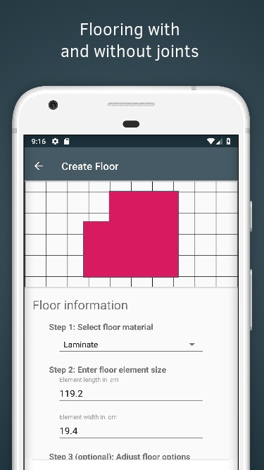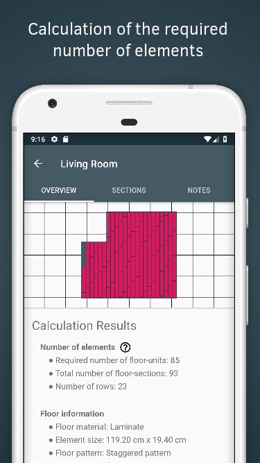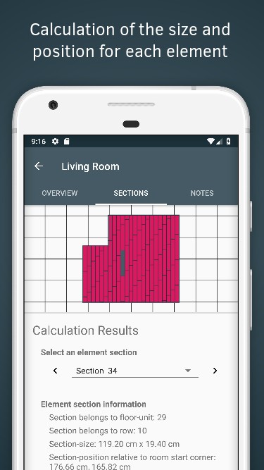 • Calculation of the required number of floor elements for user-specified rooms and floor patterns ➔ Avoid unnecessary waste material to save money and protect the environment