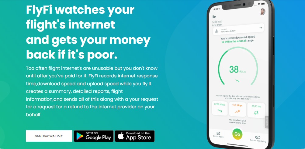 Flyfi application monitoring internet speed during inflight journey and generate complete summary report with flight information, this report send internet service provider to get refund.