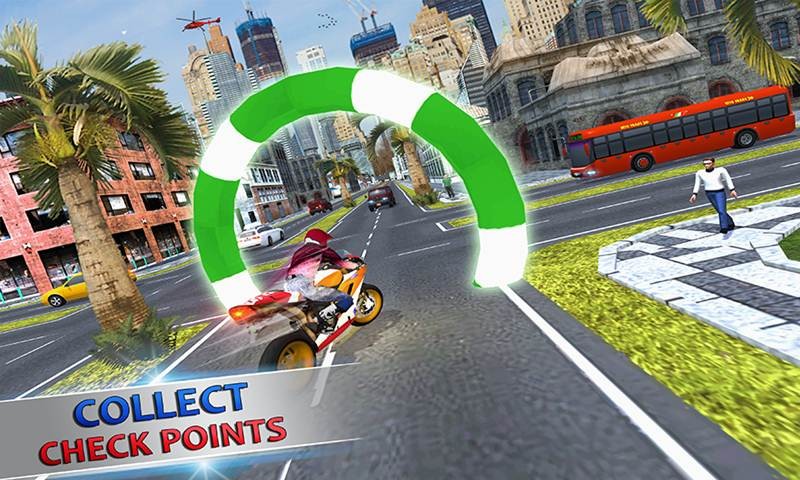Switch on your engine and explore massively unique flying bike adventure 3D game. Aspiring 3D graphics, realistic sports bike physics, enjoyable sky and city environments are waiting for you. Choose your favorite sports bike like dirt bike, heavy bike and drive on amazing city air paths.