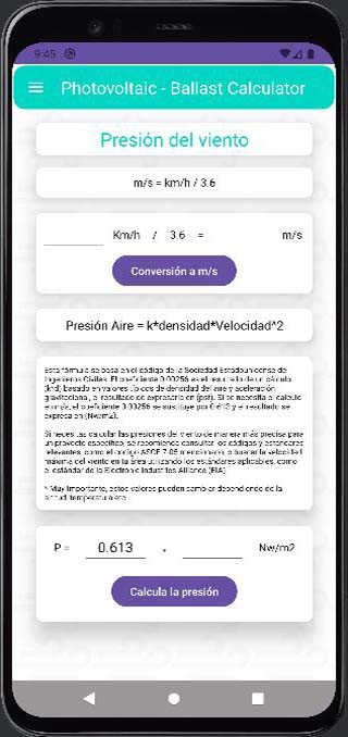 Calcula el lastre en kg necesario para contrarrestar la fuerza del viento que ejerce sobre la instalaciones de placas solares dependiendo de los m2 de instalación, la inclinación, orientación y fuerza del viento ejercido sobre ellas. Tabla de equivalencias entre m/s, Km/h, N/m2 y kp/m2.