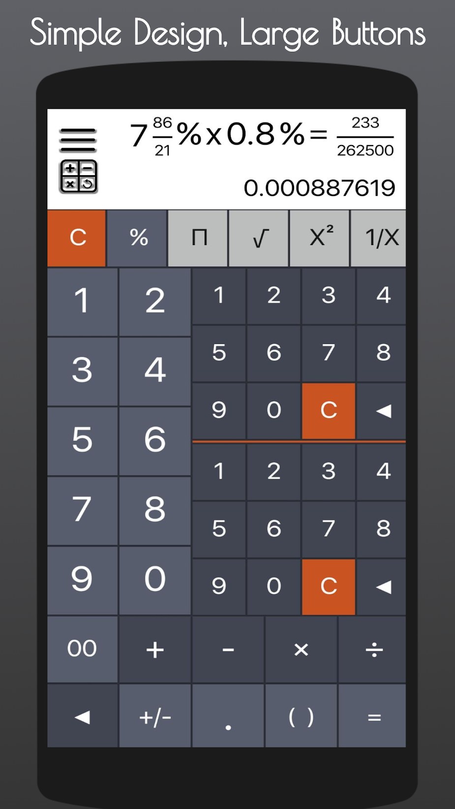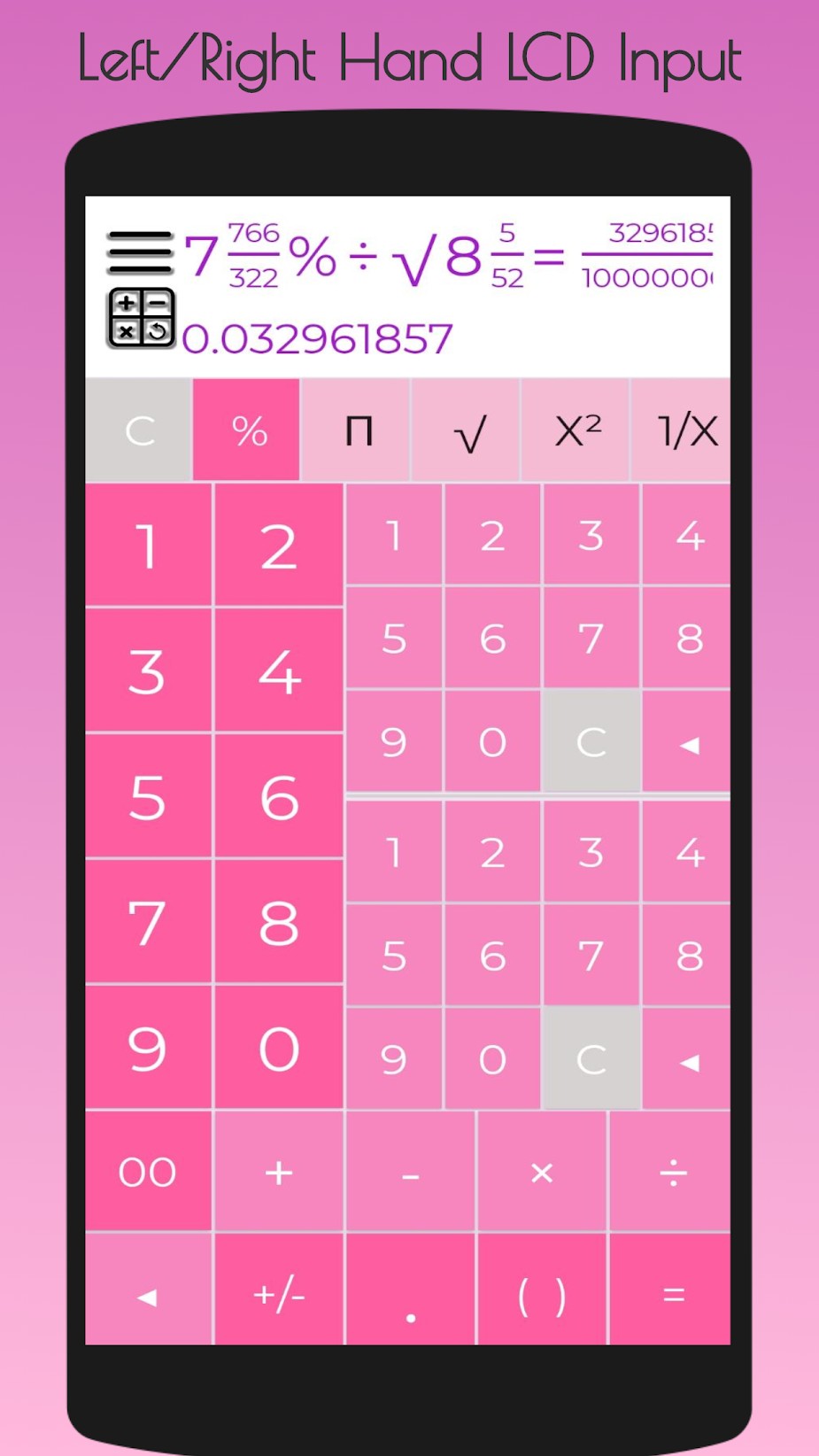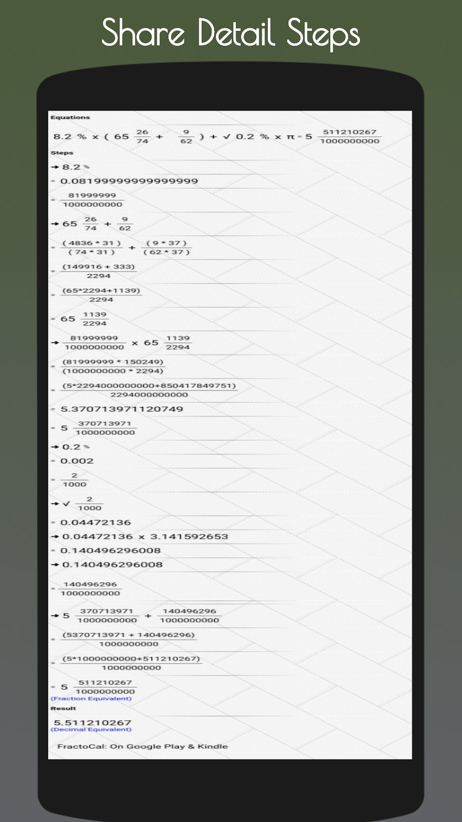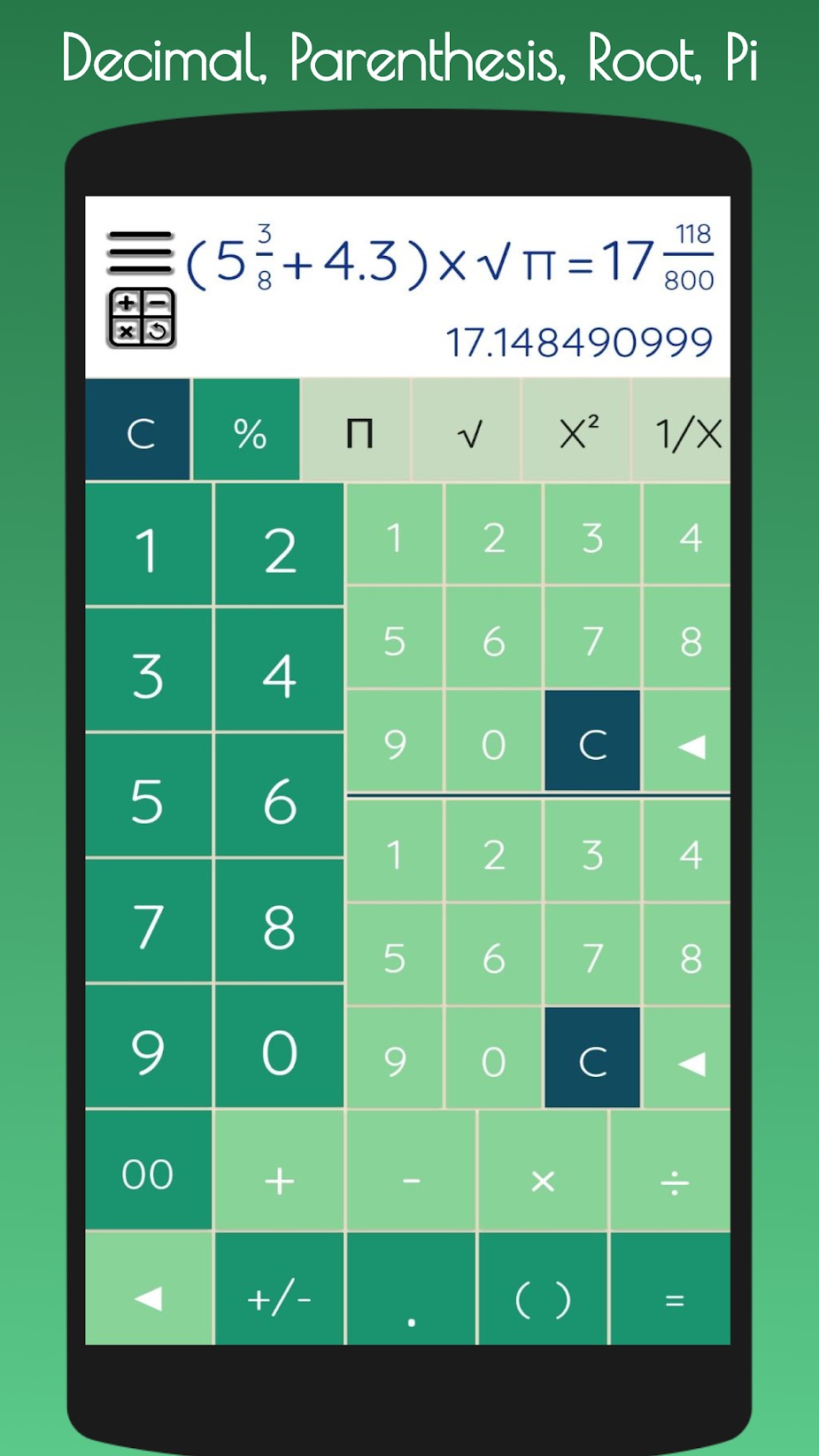 I am FractoCal, only fraction calculator on market with unique combination of decimal, parenthesis, percentage, root, square root, 1/X and pi operations. I calculate and solve fraction & math problems like no other calculator.