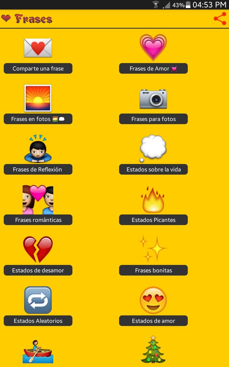 Las categorías en las que se dividen las miles de posibilidades son tan amplias y concretas que podrás encontrar prácticamente cualquier cosa que busques; estados de amor, frases de desamor, amistad, chistes, pensamientos, canciones... escoge tu favorita y pégala en tu perfil o compártela con tus contactos.