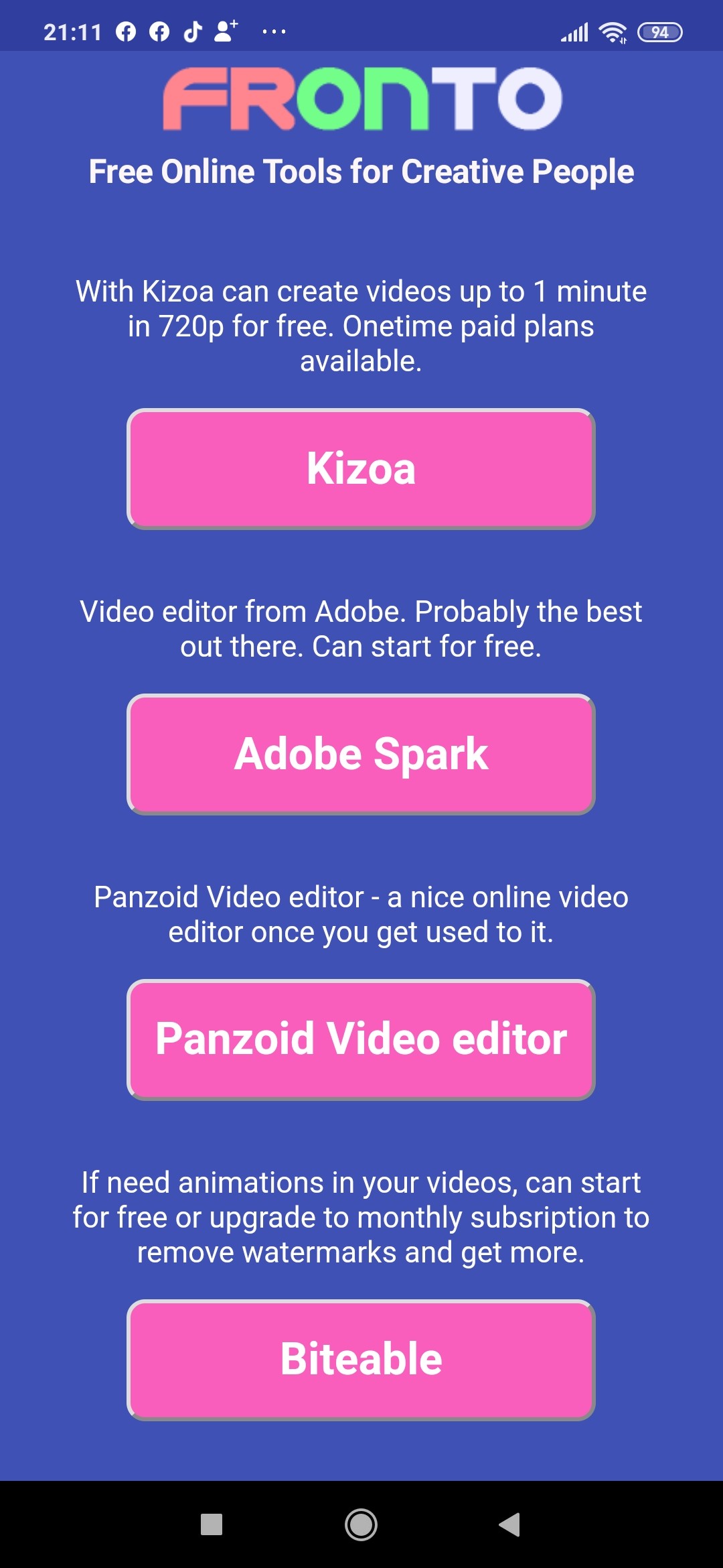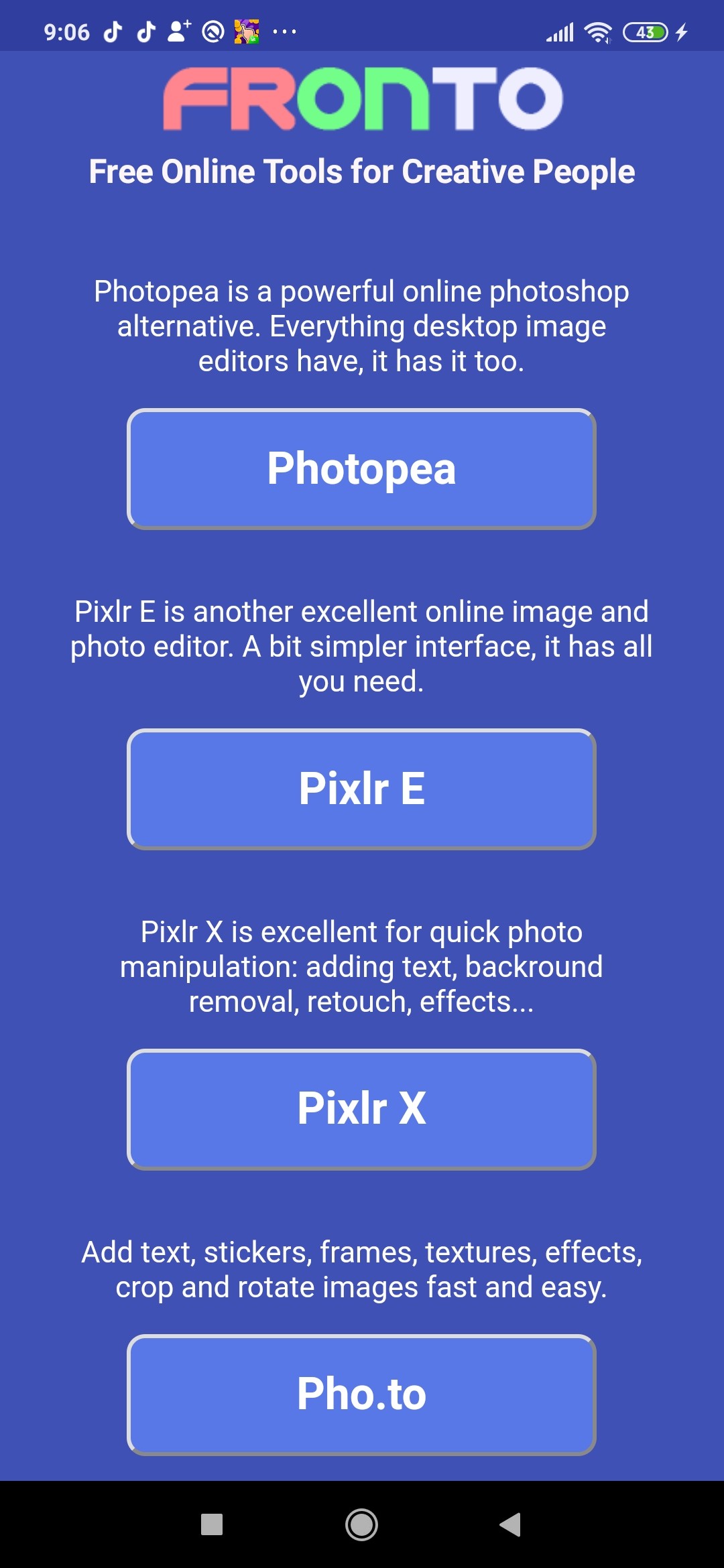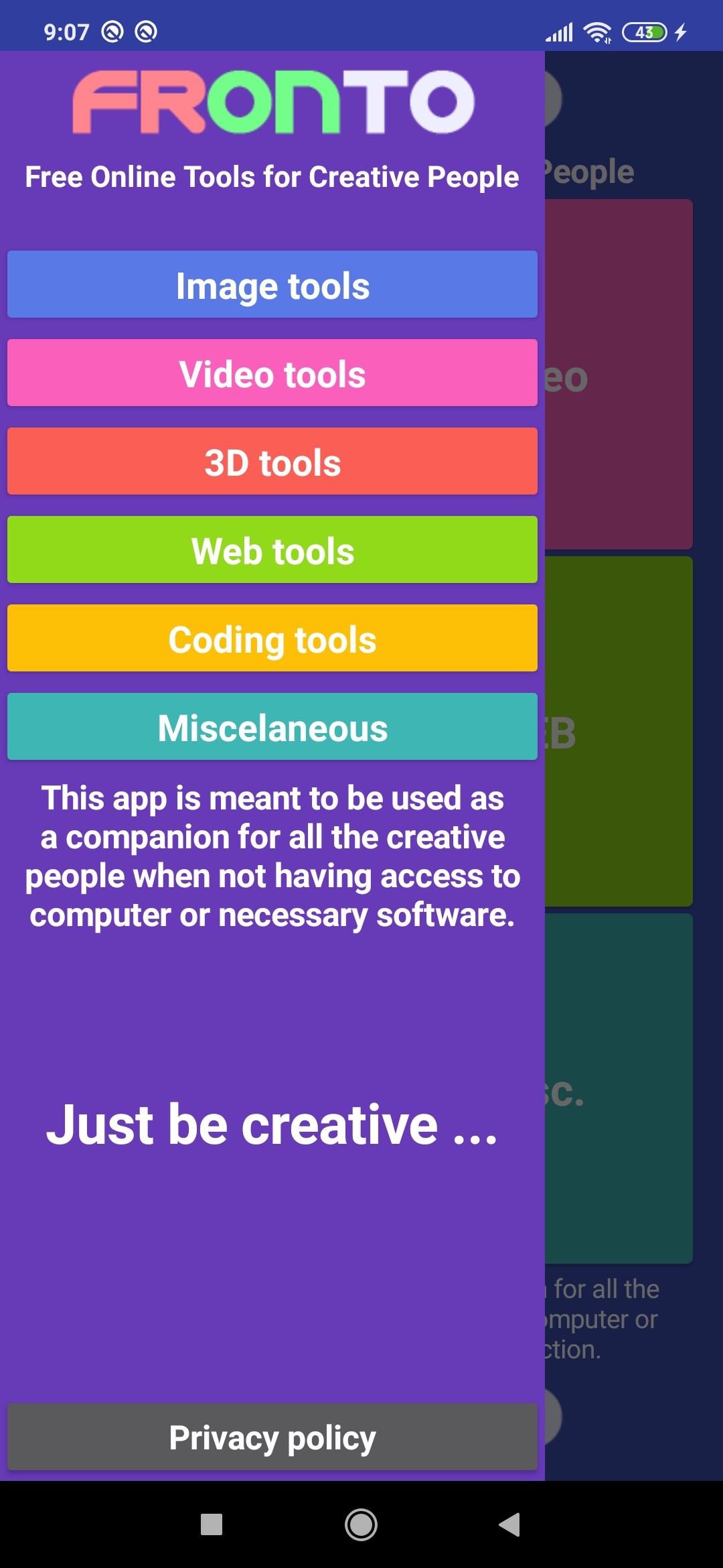 Free Online Tools for creative people is a dashboard for a creative person when not having access to a computer or necessary software and need to create or edit something fast, on the go. This app is here to boost your productivity!