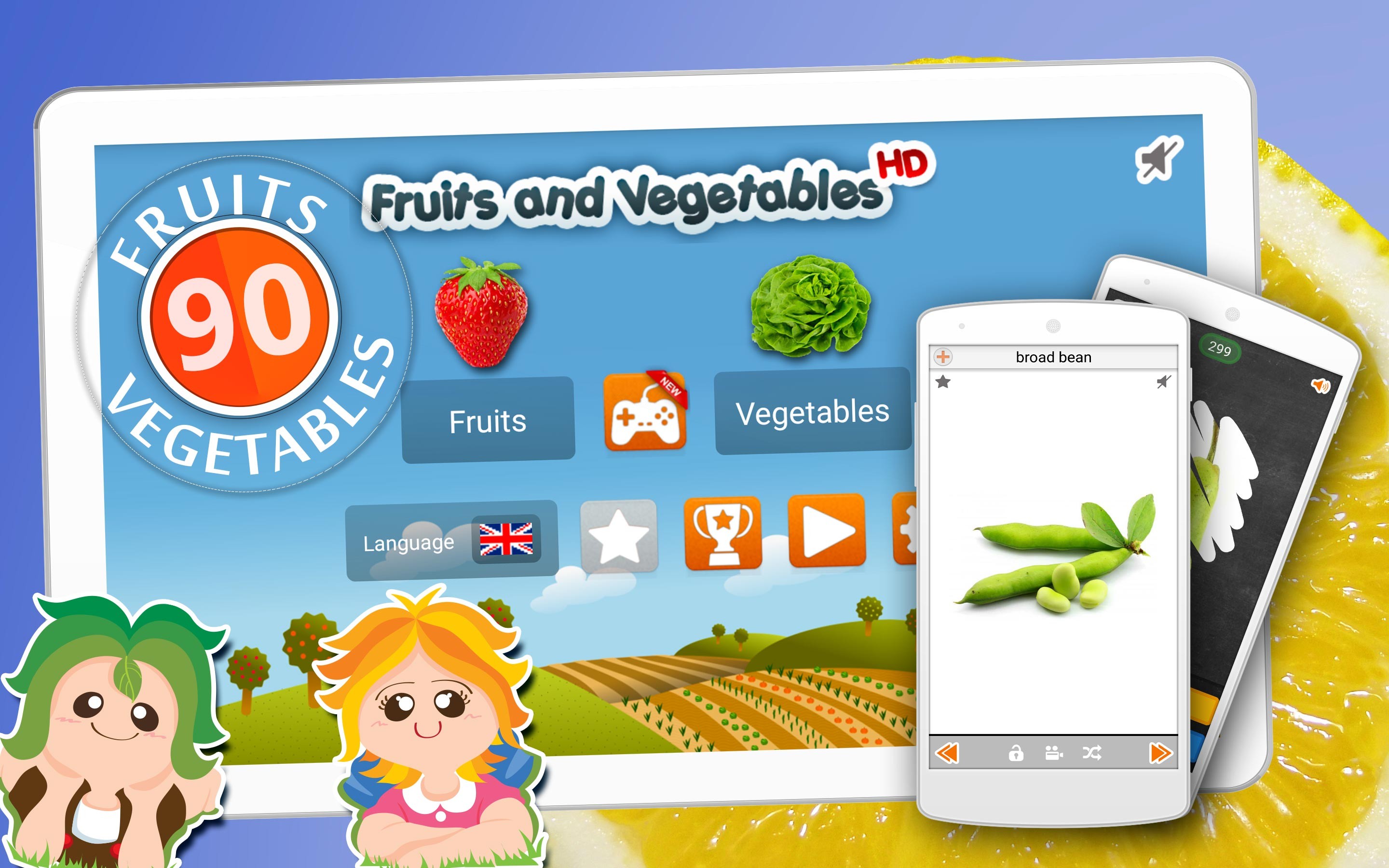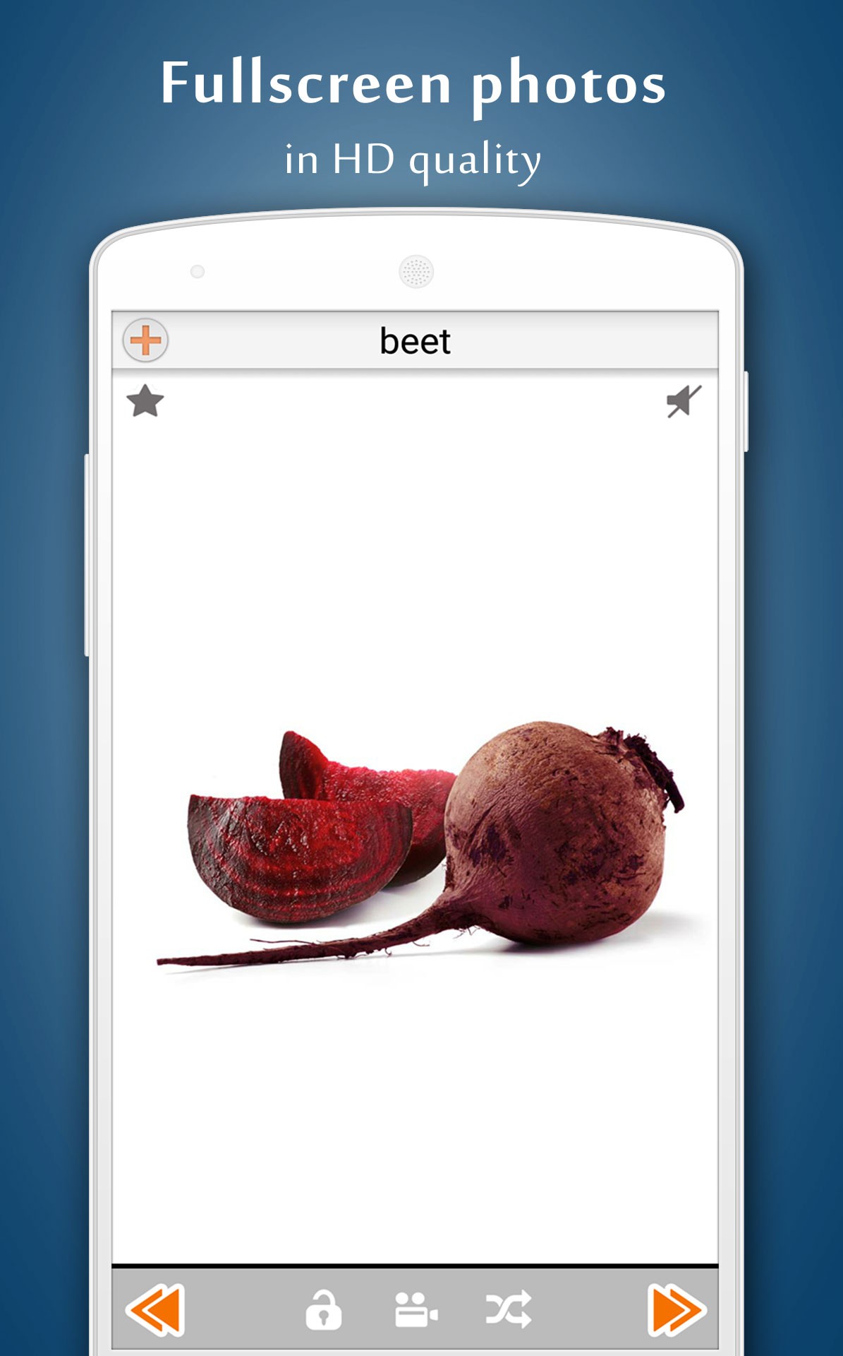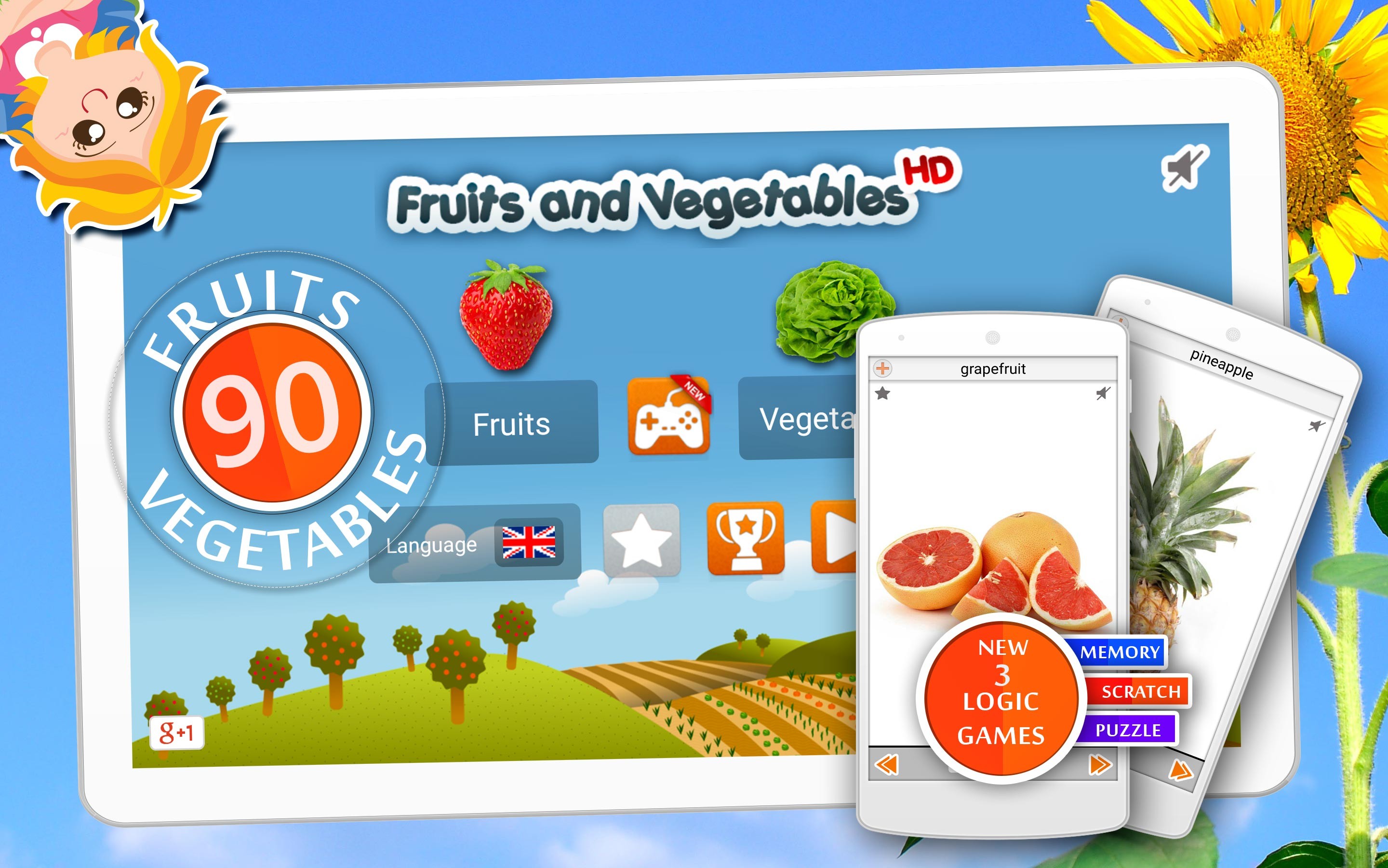 Simple and clean interface designed for children, 90 high-quality photos of fruit and vegetables in HD quality guarantee great fun. You can check their knowledge by playing quizzes and educational games.