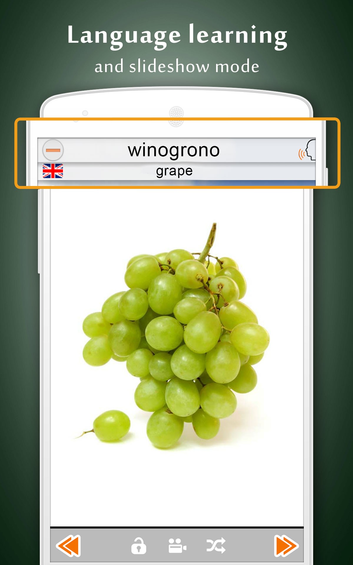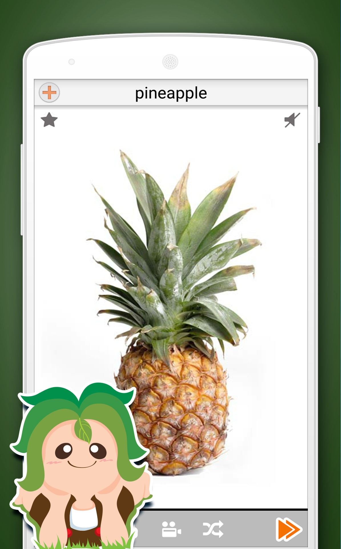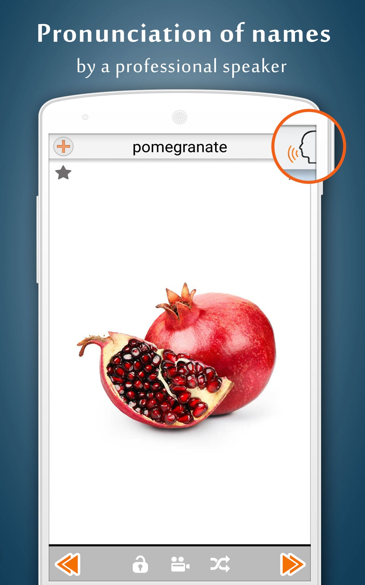Simple and clean interface designed for children, 90 high-quality photos of fruit and vegetables in HD quality guarantee great fun. You can check their knowledge by playing quizzes and educational games.