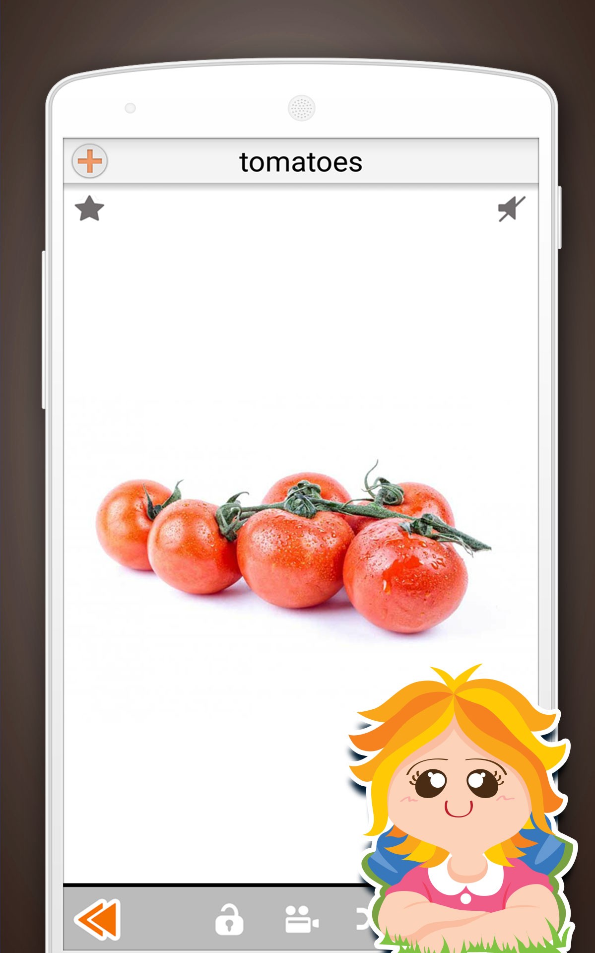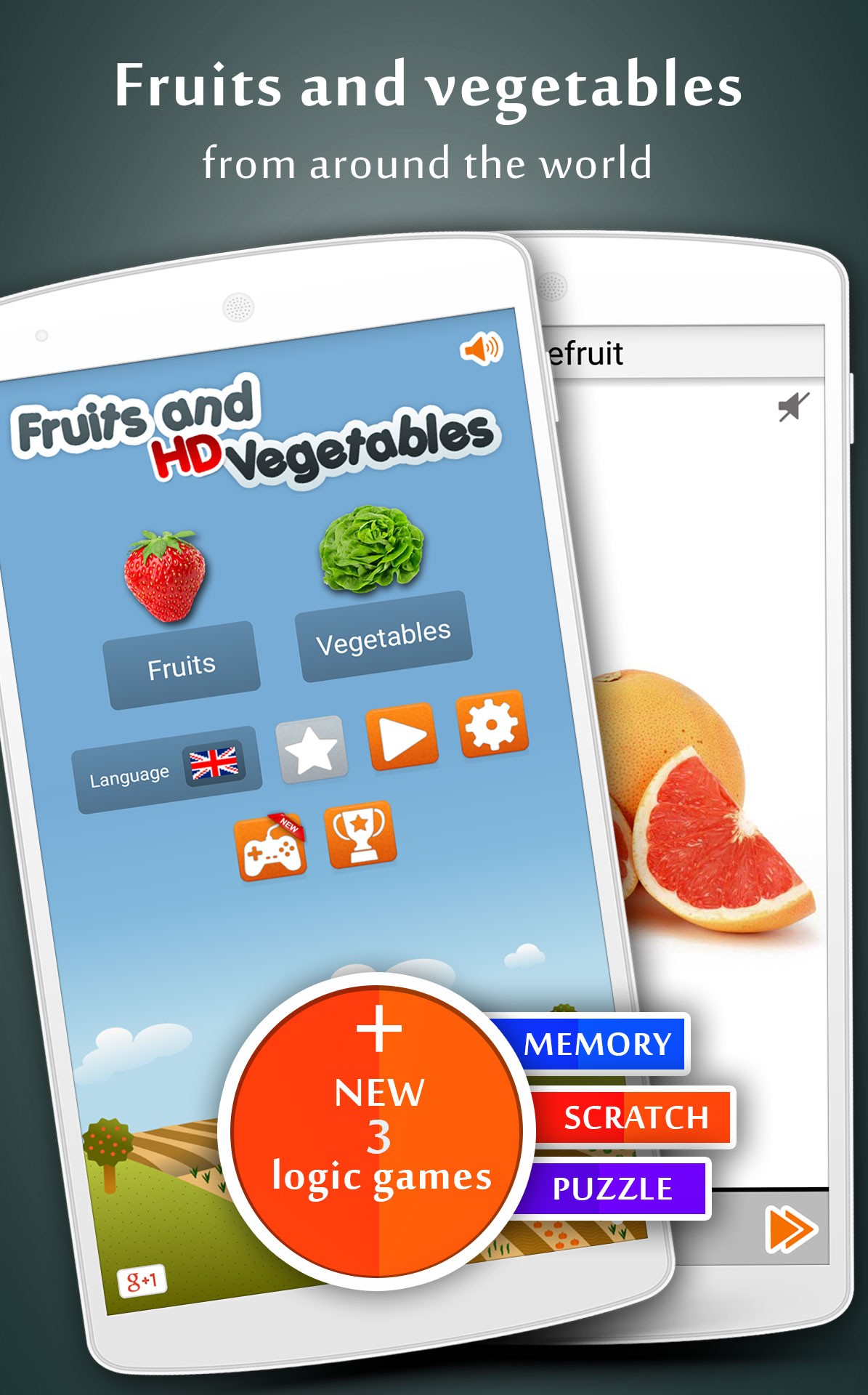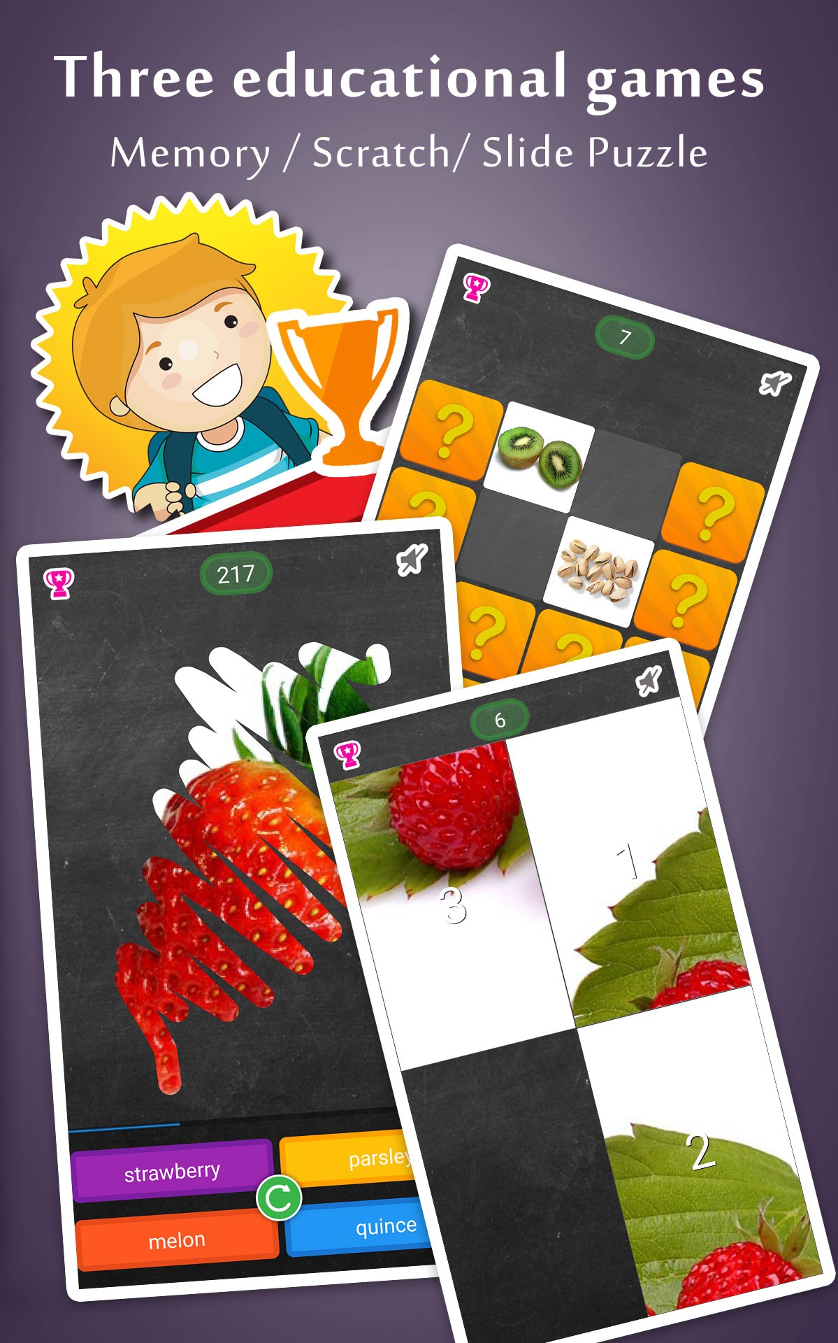 Learn first words, explore fruits and vegetables and play a memory, puzzle and scratch game.