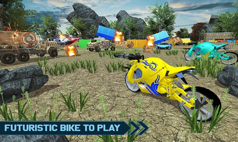 Start your motorbike and use your shooting techniques to smash the futuristic cars to complete the thrilling missions. Move from one troop to another in the battle arena and collect bullets as well as a missile to increase your capability level & become bikes battleground players of the free roaming open environment.