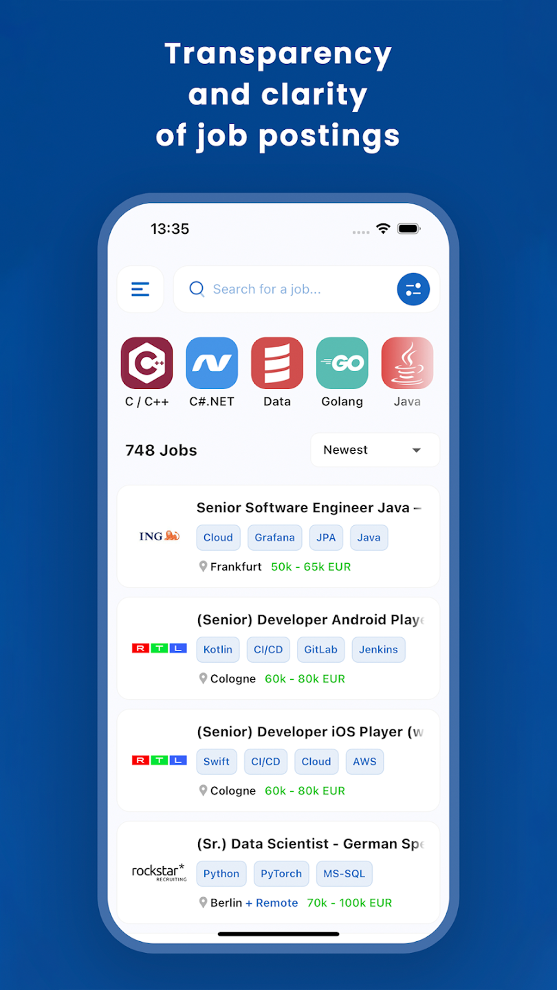 We've compiled an extensive collection of job listings from all over Germany and organized them in a user-friendly interface. Explore roles that align with your salary expectations, preferred technologies, and desired locations. Bid farewell to searching across multiple websites — we've got you covered!