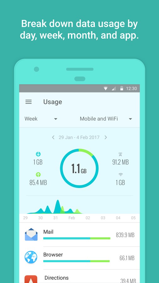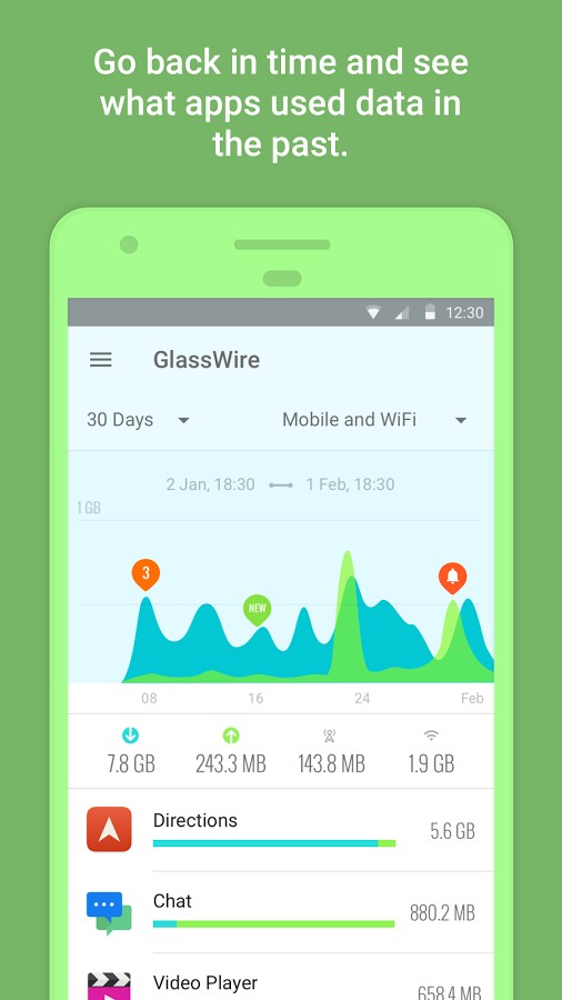 GlassWire makes it easy to monitor your mobile data usage, data limits, and WiFi Internet activity in real-time. Instantly see what apps are slowing your phone’s Internet connection or wasting your mobile data with GlassWire’s graph and data usage screens.