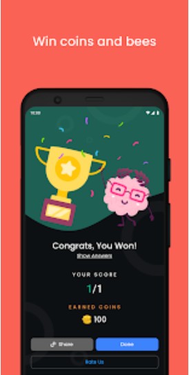 View your current level, the total number of quizzes taken, quizzes won, correct answers, coins, and bees in your profile