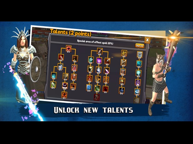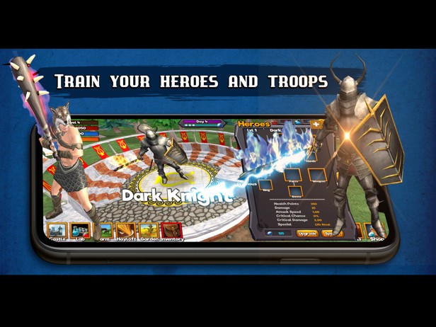 Discover amazingly powerful heroes and upgrade to make them unbeatable. Get coins to purchase anyone from Dark Knight, Champion, Gladiator, Templar, Berserker, Arch Mage & more. Follow and improve their Health Points, Damage, Attack Speed, Critical Chance, Critical Damage, Special Attack). Alternatively, grow and upgrade your troops by enhancing the Swordsman, Spearman, Cavalry, Javelin man, Archers, Mage.