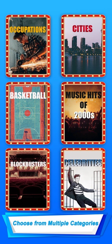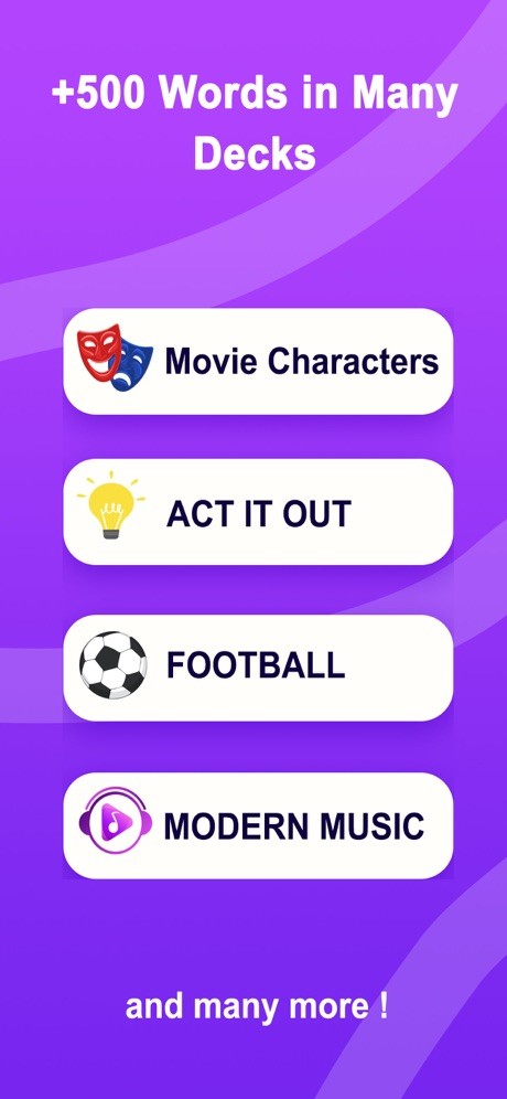 We have as classic decks (movies, celebrities, act it out, etc.) as unique decks (art, video games, etc.). Different decks have different levels: from easy to hardcore. If you can guess 2 words in hardcore deck Art - you are really genius!