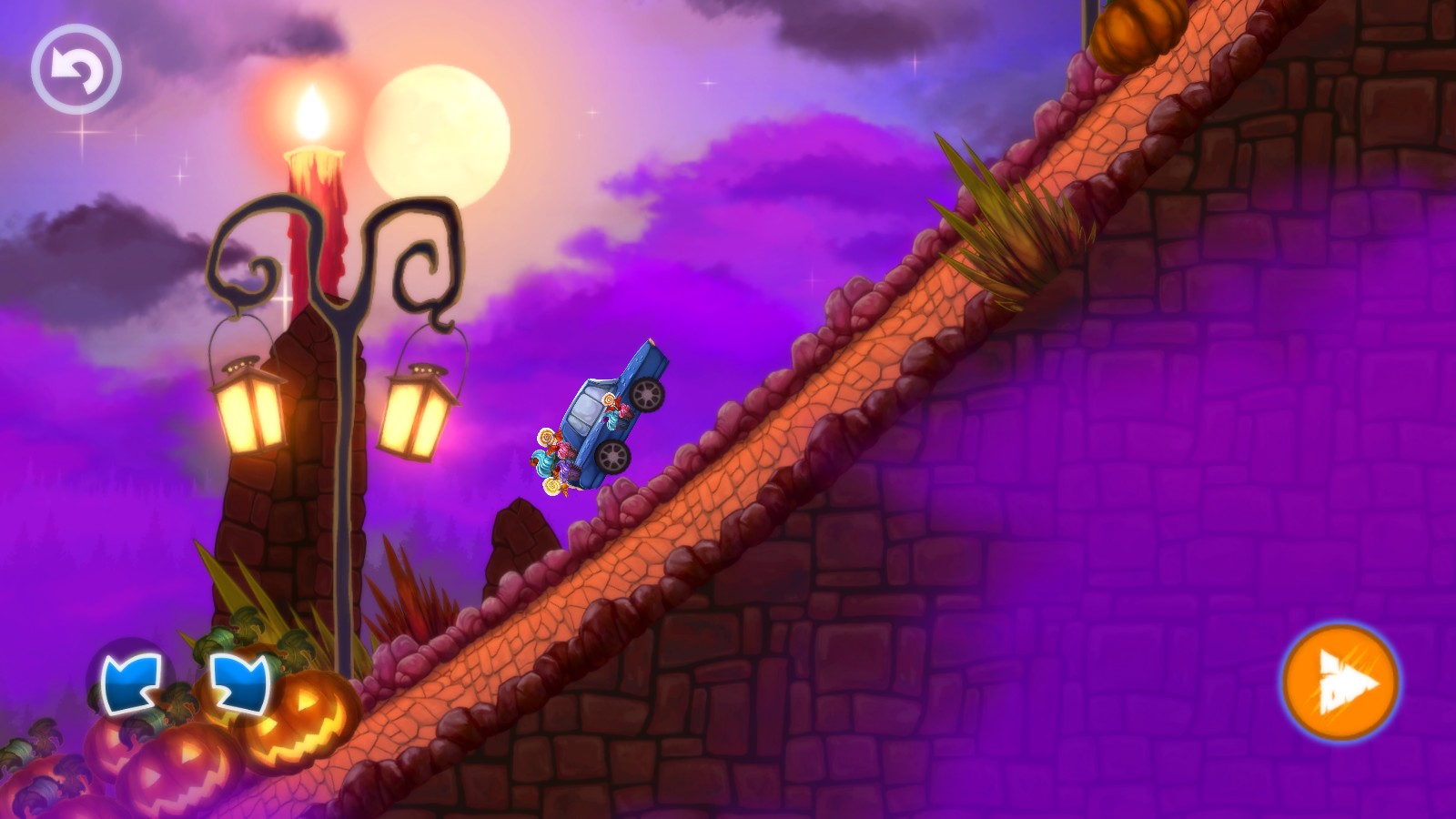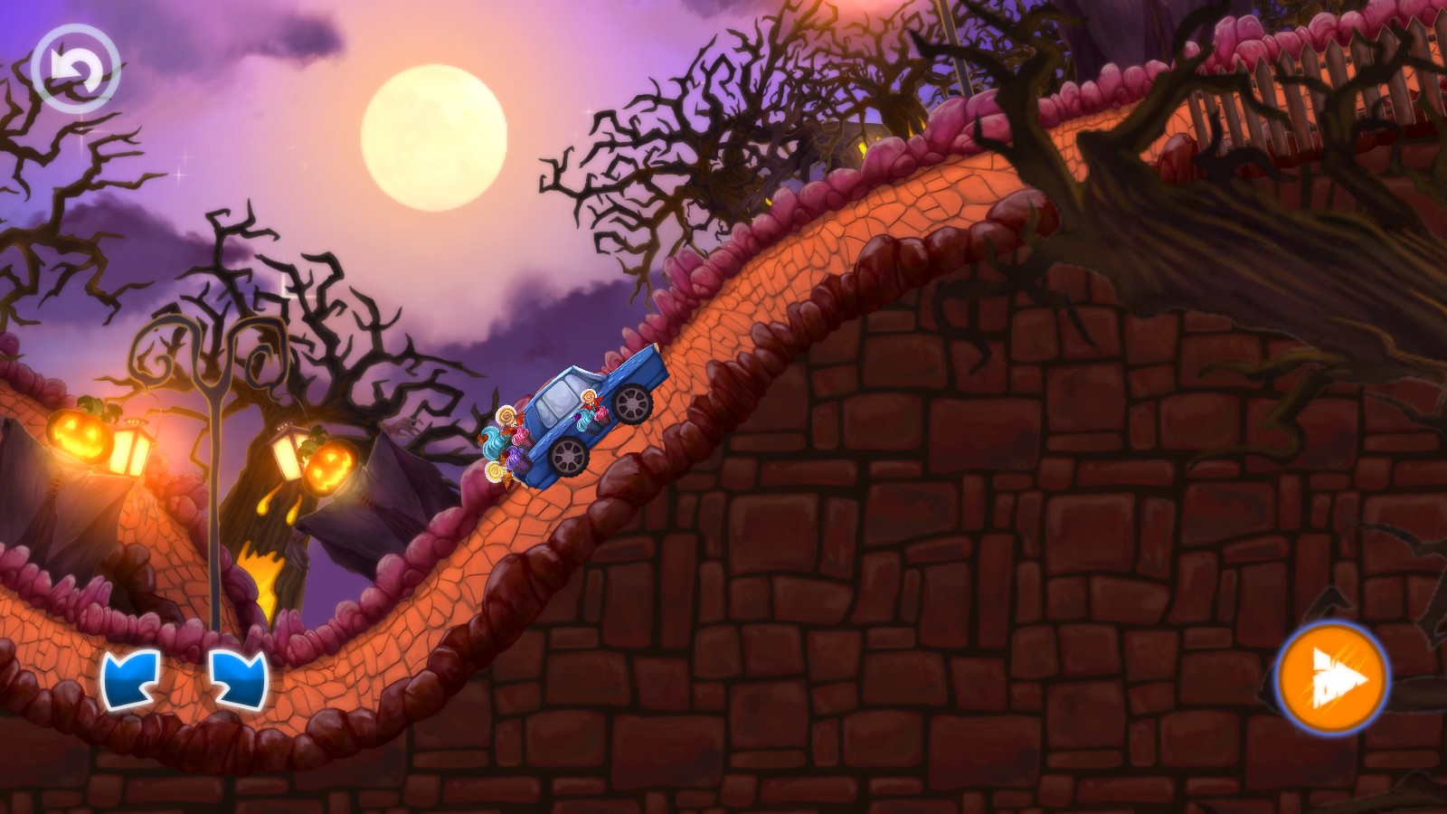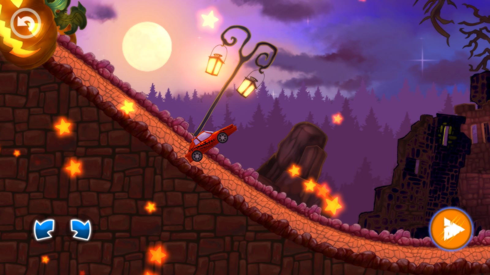 Ride and enjoy intuitive and easy game control: click GO button to drive forward and arrows to balance your spooky car while you race.