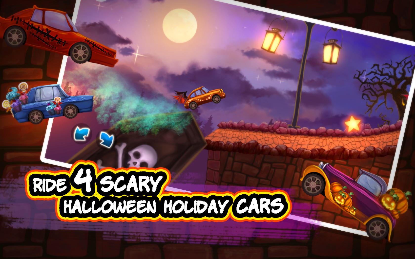 Choose from 4 free spooky Halloween holiday cars to drive with: The sCAR, Draculini, Treatster Trickster and Pumpkinstein.