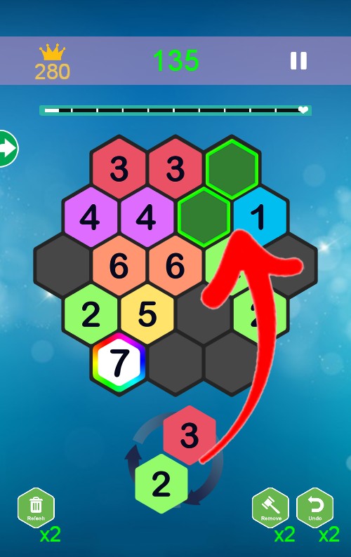 - Drag a numbered hexagon block into the cells to place them. You can tap to rotate it before placing them.