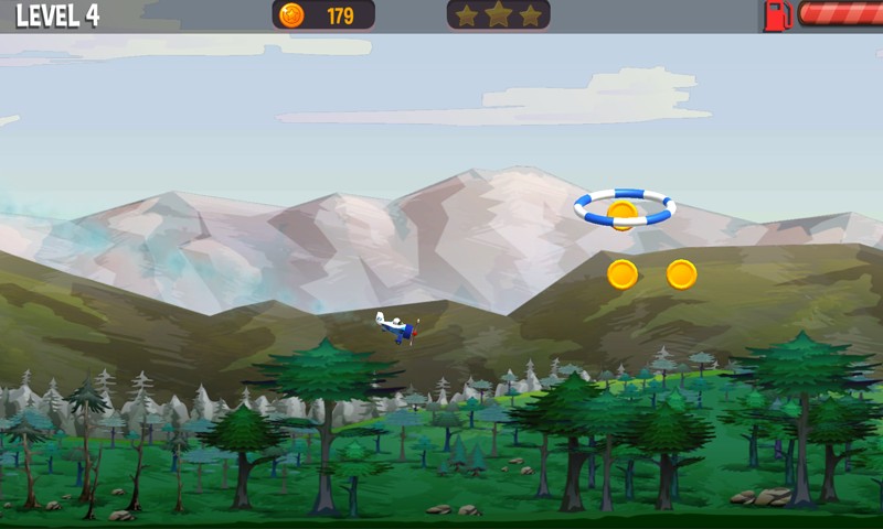 Fly the plane as it moves forward. Collect coins, which can be used to purchase different items such as planes, add-ons etc. from the in-built game shop. Make your aircraft perform stunts by going up-side down, passing narrowly through horizontal and vertical rings. Pick up fuel to keep the plane in the air for as long as possible.