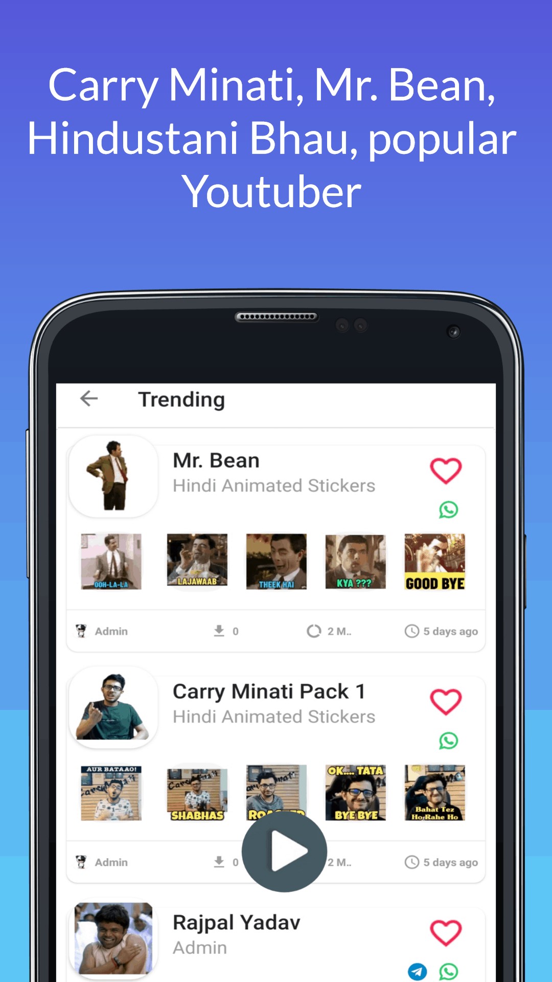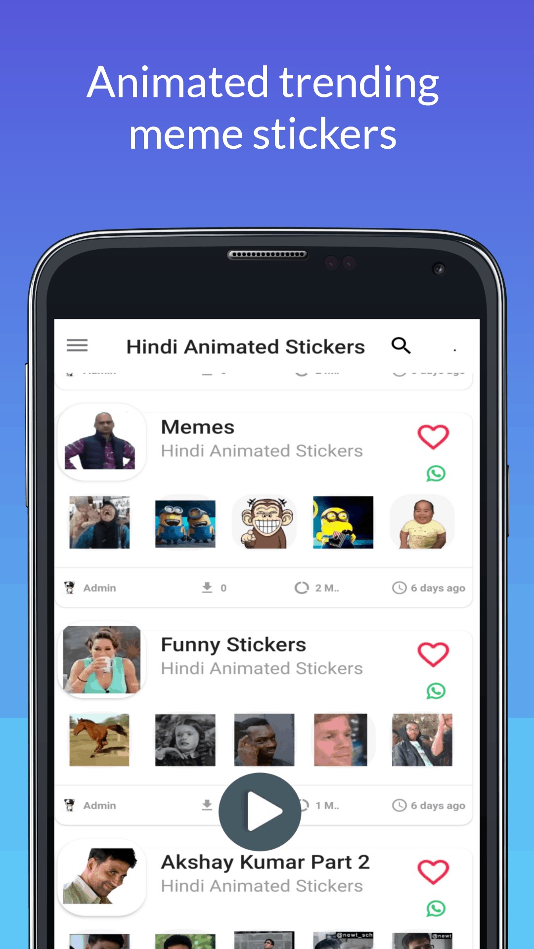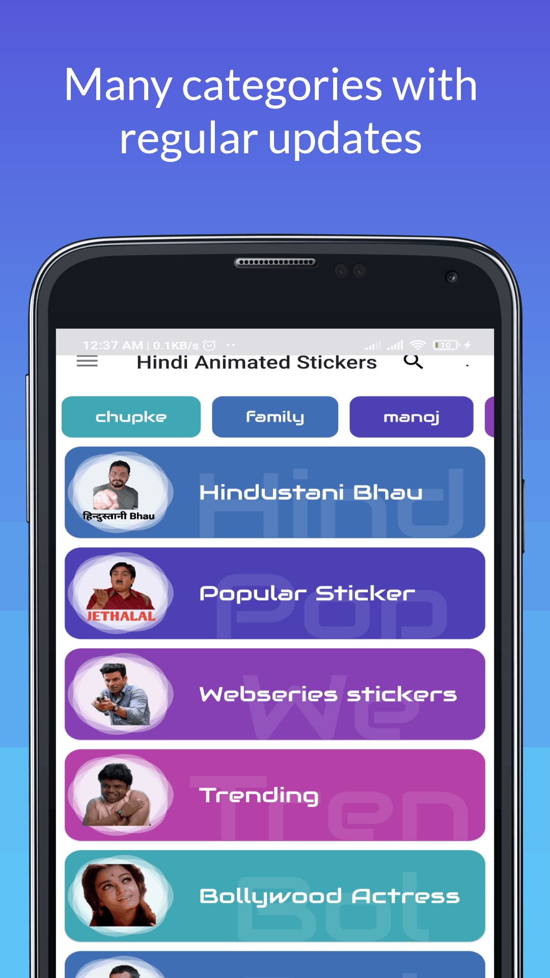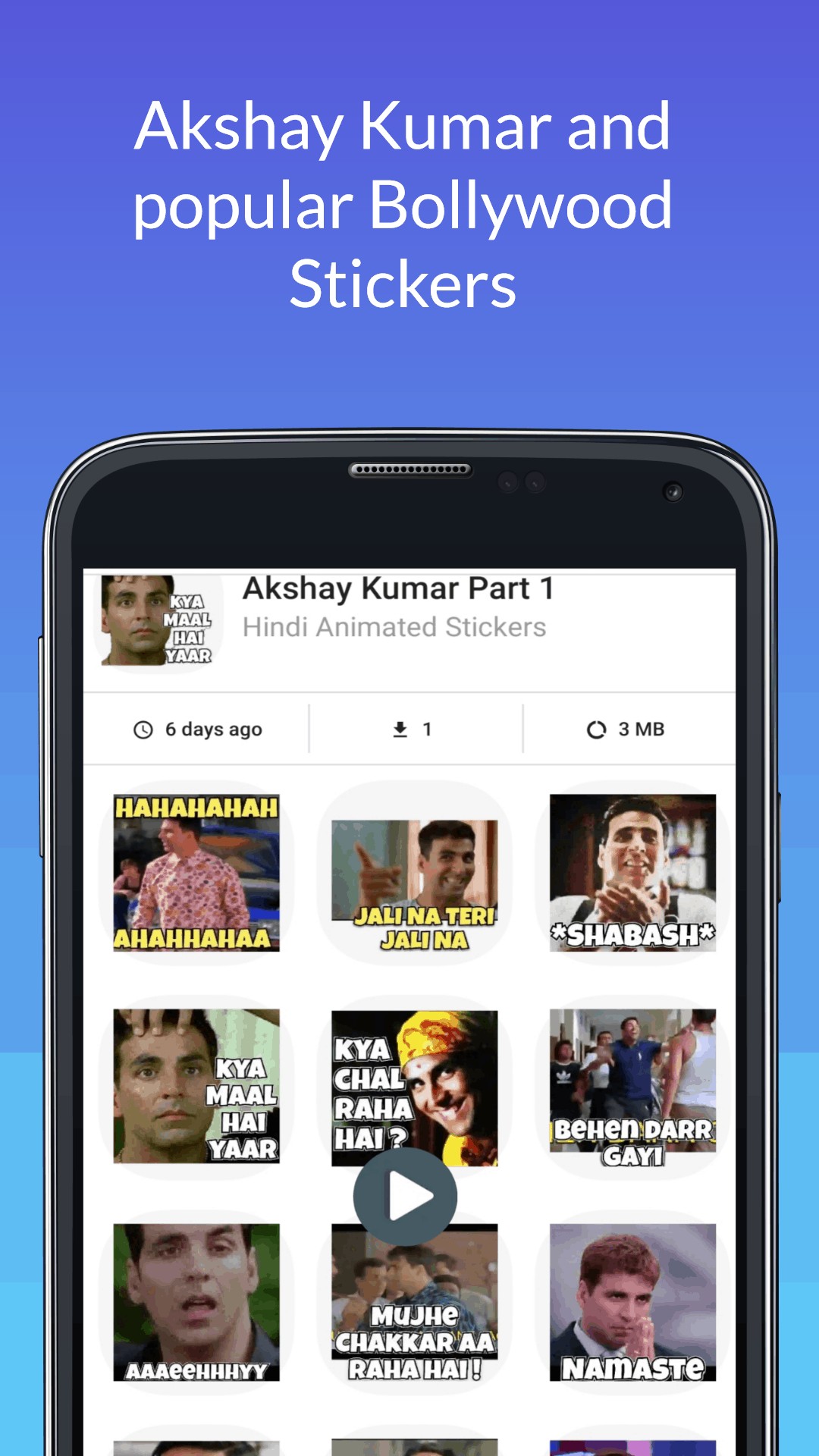 We are pleased to inform you that Animated Hindi Stickers is our new App for WhatsApp. In this App, we have uploaded all popular animated WAStickers of latest web-series like Family Man 2, Tandav, Mirzapur 2, Sacred Games, popular You Tubers like Carry Minati, Hindustani Bhau, Bollywood Stickers of popular actor like Akshay Kumar, Pankaj Tripathi, Rajpal Yadav, Paresh Rawal, Bollywood movies like Phir Hera Pheri, Chupke Chupke and Bollywood actress like Deepika Padukone, Katrina Kaif. Besides it many animated stickers of latest trend, meme, funny, Emoji, Cute Baby are also there.