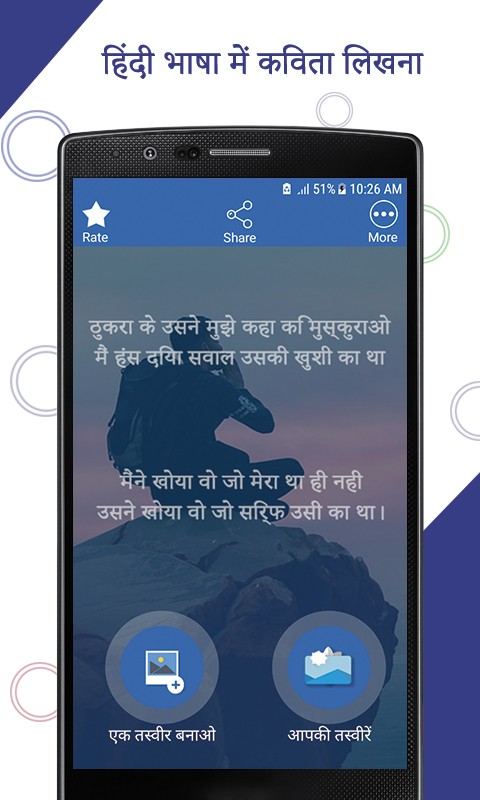 With 2018 hindi latest shayeri you can type on photos also type your emotions and feelings with justwords in your favorite hindi sairi language on your photos and vast category of frames of sad, romantic, love, friendship, rain,filings, december by using writing hindi poetry on exam shayari app.