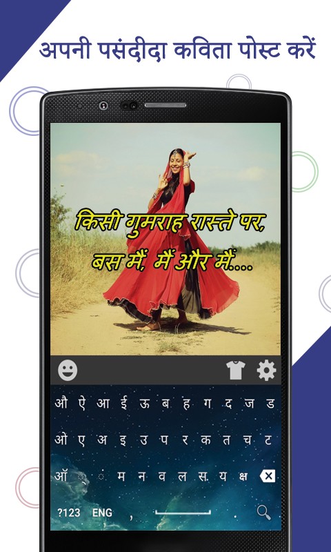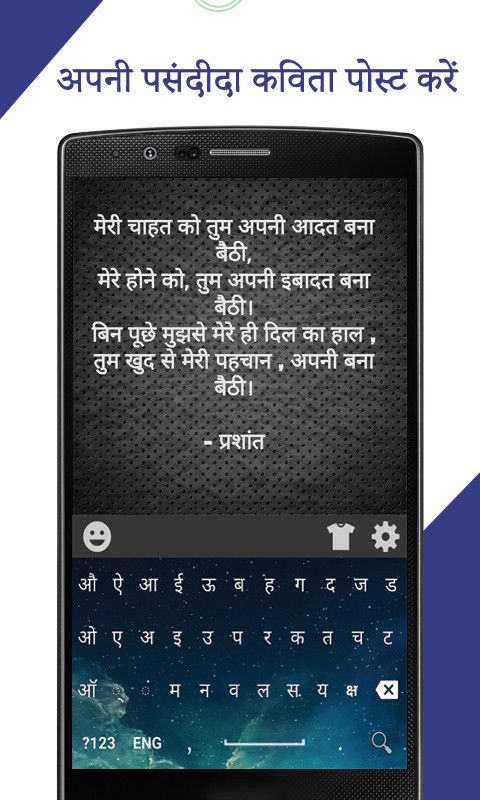 This all hindi shayari app, hindi shayari new 2018 has a full and easy to use Hindi keyboard to write romantic poetry in pictures, quotes, dialogs, jokes or status on pictures.