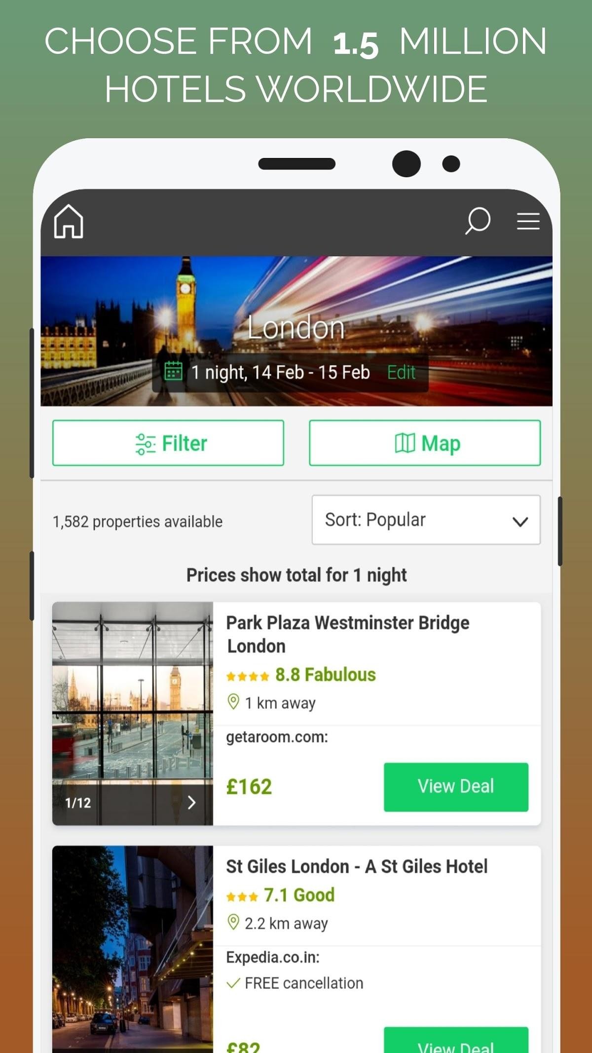 We compare the price of each hotel with 5 000 000 s of online hotel booking websites.Hotel Booking is an app designed to help you find the right hotels where you can get proper accommodation at a very good price. The app covers thousands of hotels all over the world, and you have an immediate hotel price compare feature and a great way to find great and cheap accommodation anywhere you want to go.