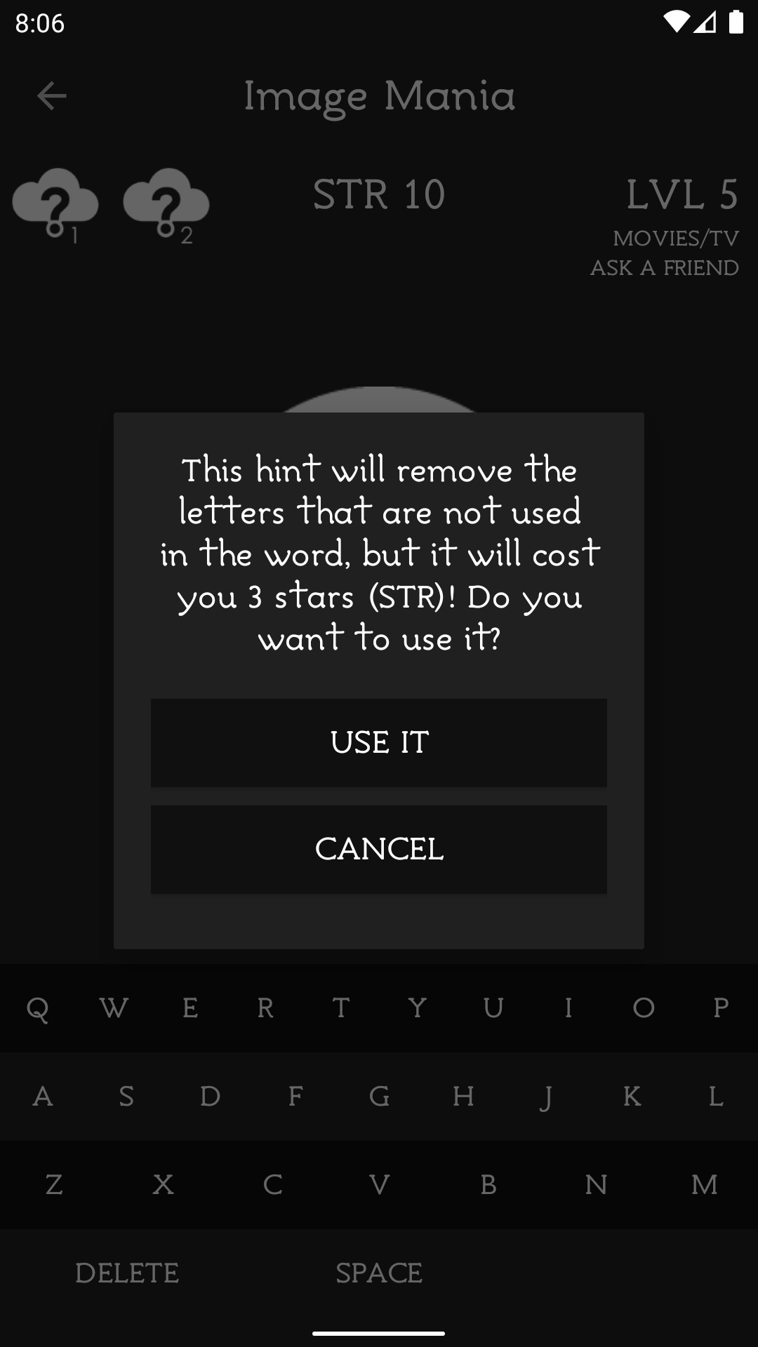 This is Image Mania. The game will show you different images of movies, celebs, song names, music artists and other stuff in different categories. Your goal is to guess the words hidden behind the image. If it is hard for you to guess any of the items, just use one of the hint buttons in the upper left corner. It will cost you 3 or 6 stars (STR), but don't worry, every guessed image will give you a new star. If you want, you can ask a friend for help. Enjoy and try to guess them all!