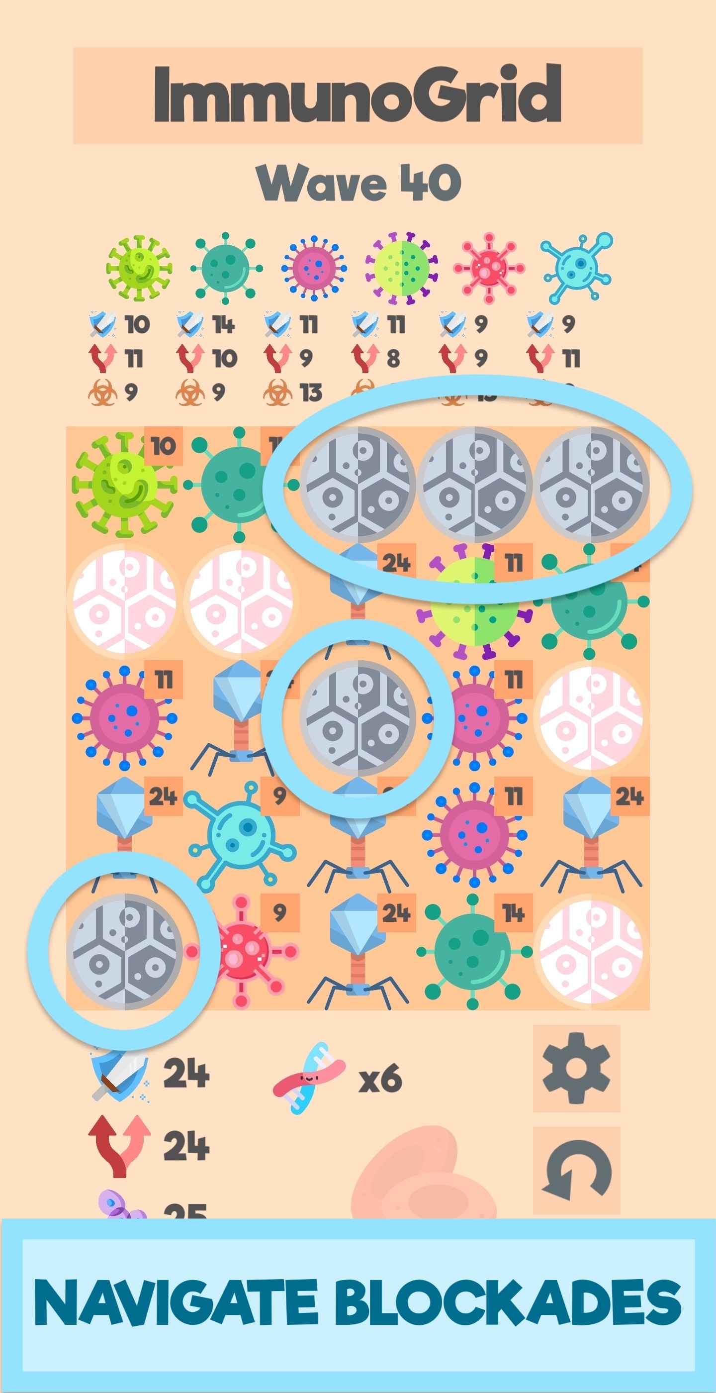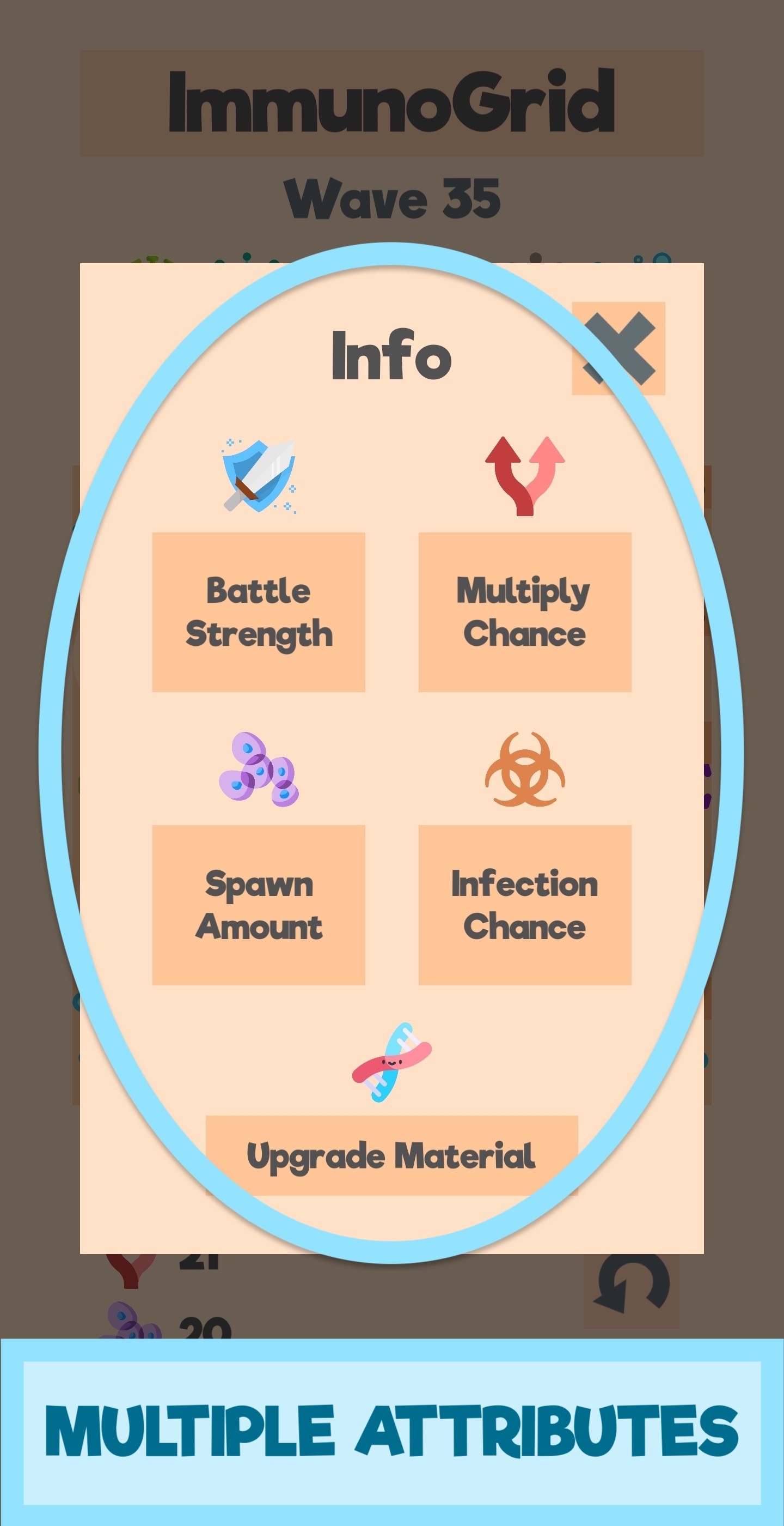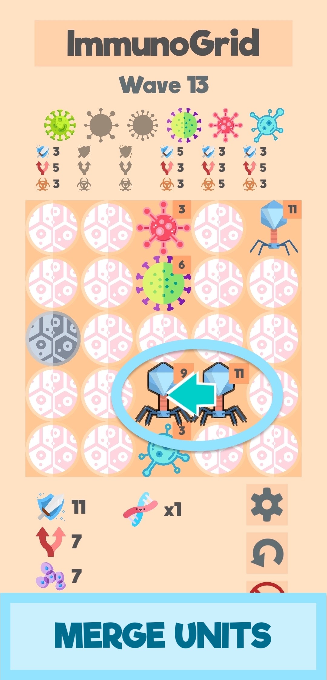 Merge antibodies for extra strength and defeat the enemy bacteria before they have a chance to multiply and infect nearby cells. Make upgrades after each wave to strengthen your genetic army of antibodies and fight off the endless waves of relentless bacteria.