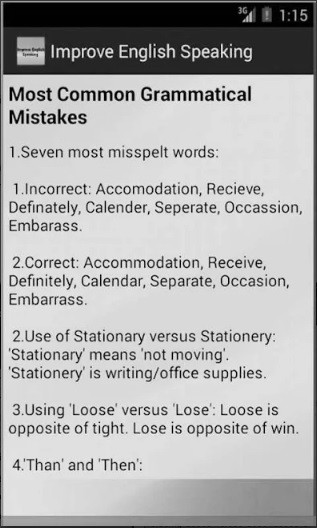 This application describes the top methods to improve English communication skills in this era of technology.If user apply these tips in daily life,soon he will be the master of English communication skills.In starting,focus on fluency,not grammar to improve English speaking.As the time passes, grammar will automatically improve along with fluency.The best way to learn English is to practice spoken English without worrying about grammar.By following tips of this android application one can enhance English conversation skills to new heights.