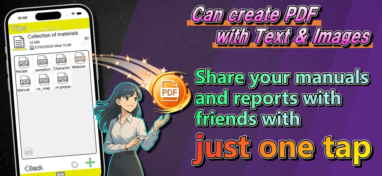 You can create PDF files using Content and Images recorded in this app as manuals/recipe/illustrations.