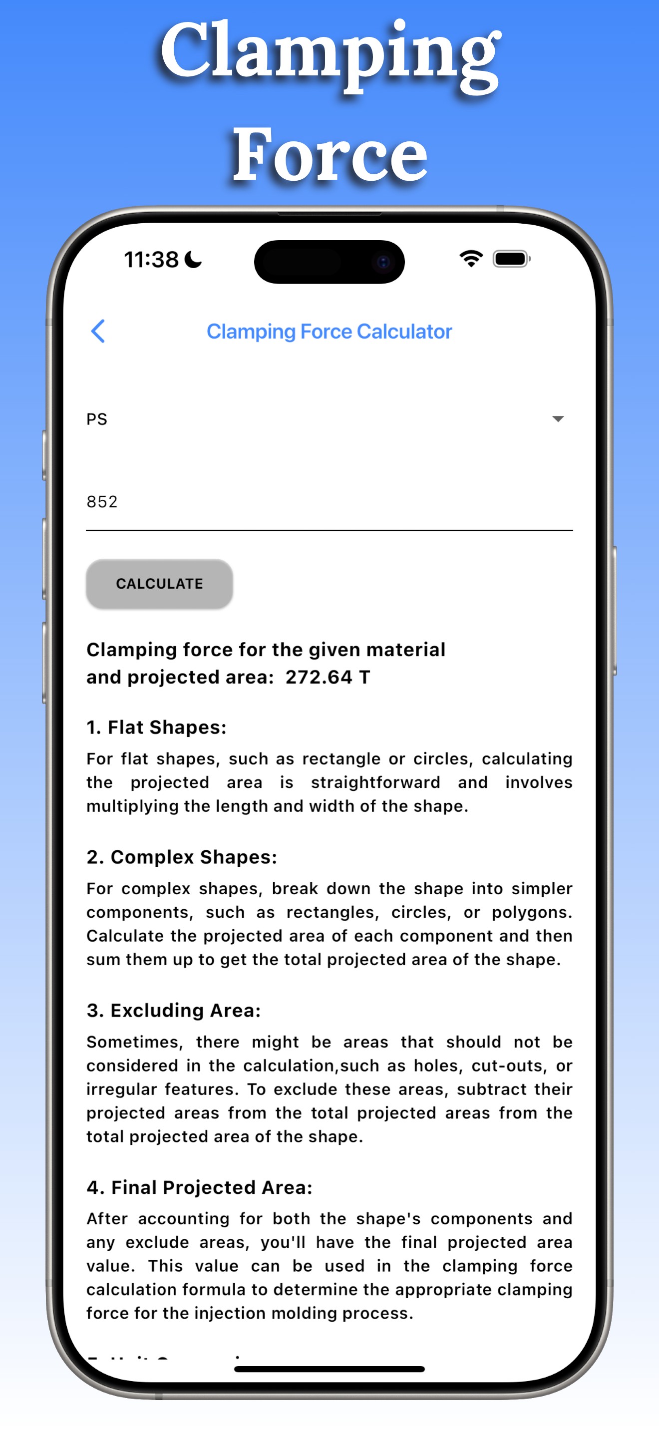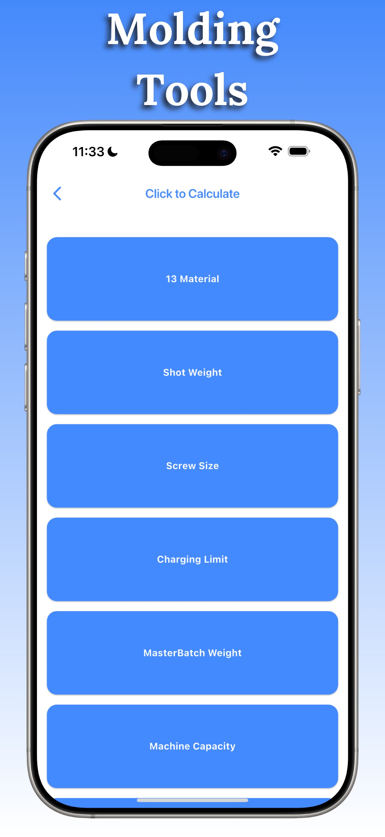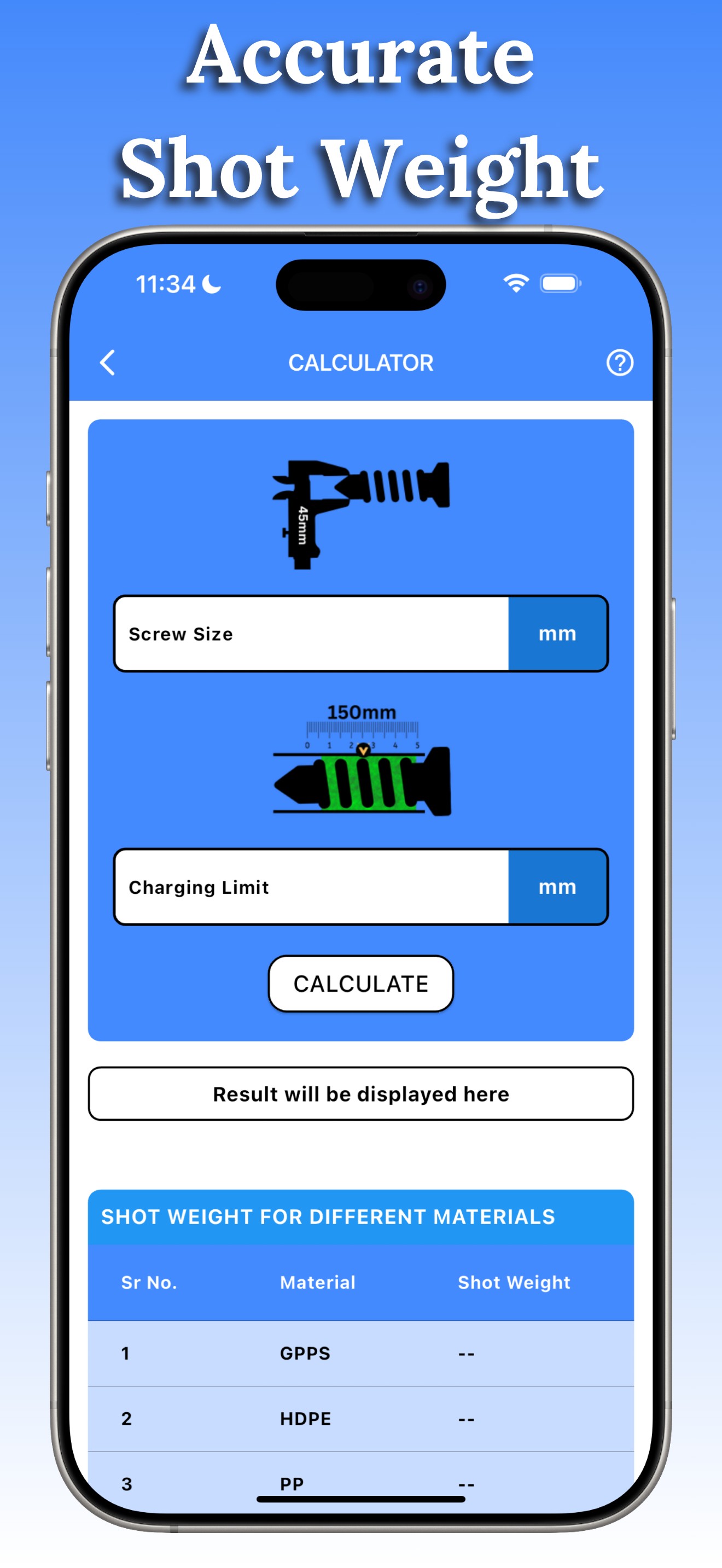 Whether you’re estimating material shot weight, determining screw size, or calculating clamping force — this app brings every essential tool into one easy interface.