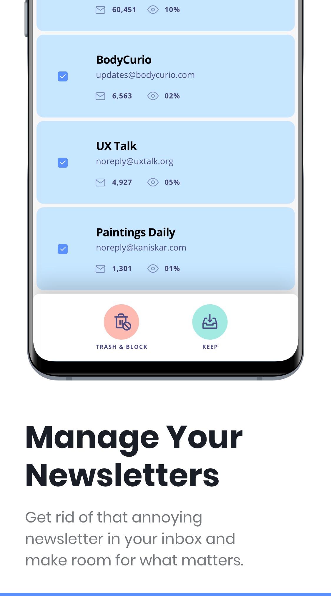 InstaClean let’s you get rid of newsletters/spam/advertising emails with just ONE click.