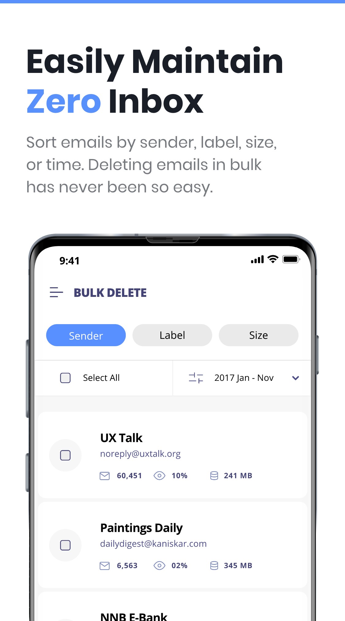 -The application gives you general data on what mailing lists you follow regularly. You can use this data to easily determine which mailing lists to unsubscribe from. It allows you to easily filter spam emails and delete bad and unwanted emails. Works with Gmail, Yahoo Mail, Hotmail, Outlook and More!