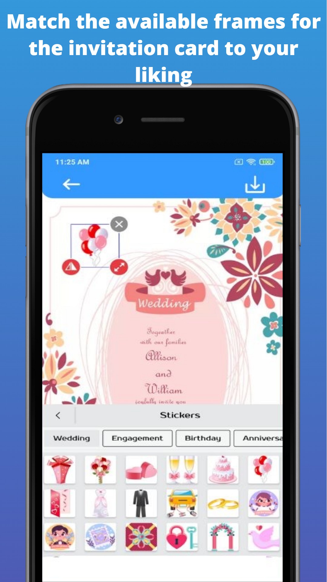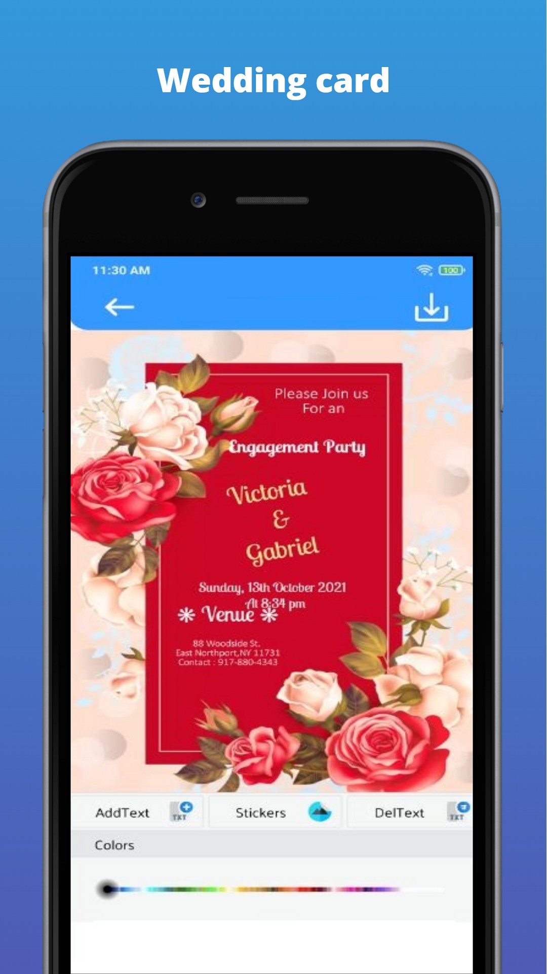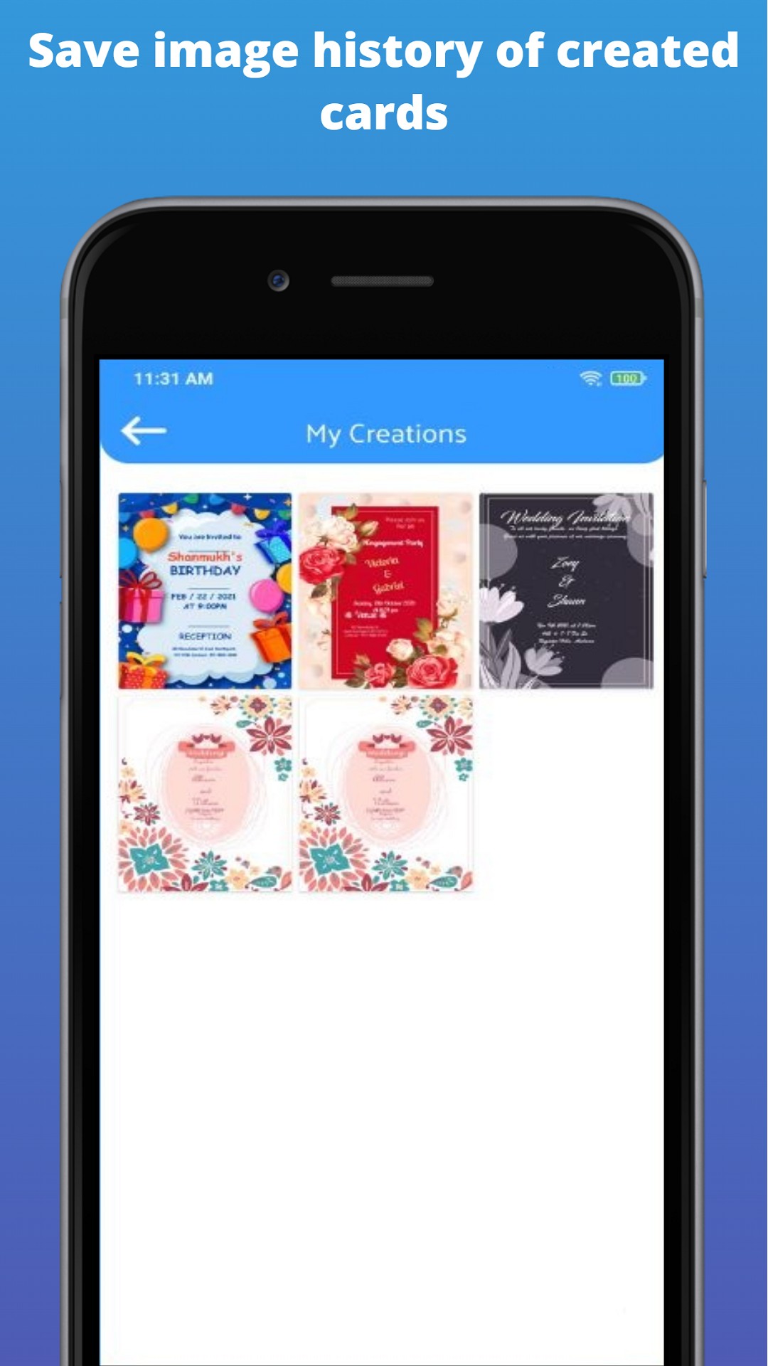 * Save & Share option to send your invitation cards (via) various social media networking apps