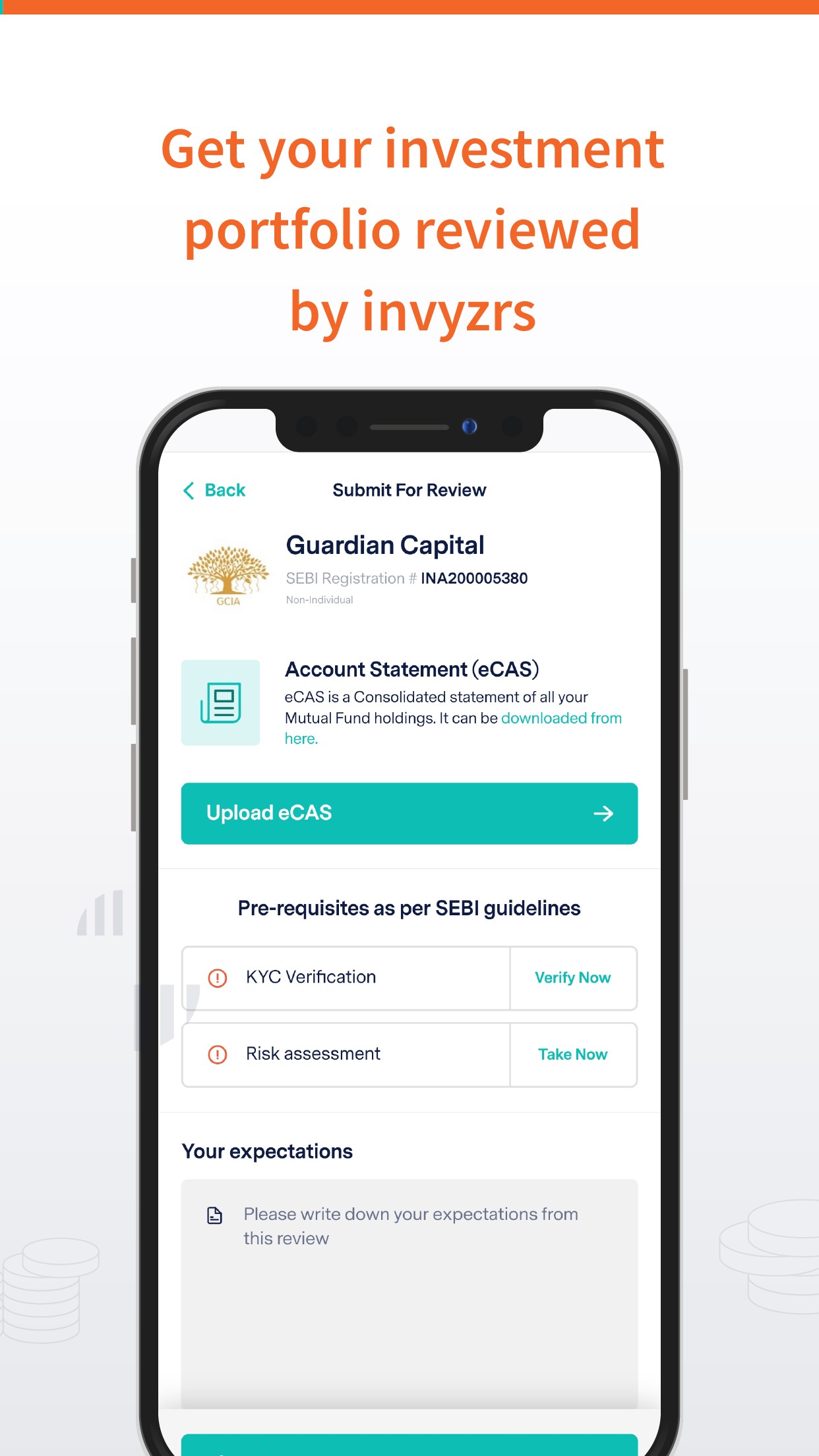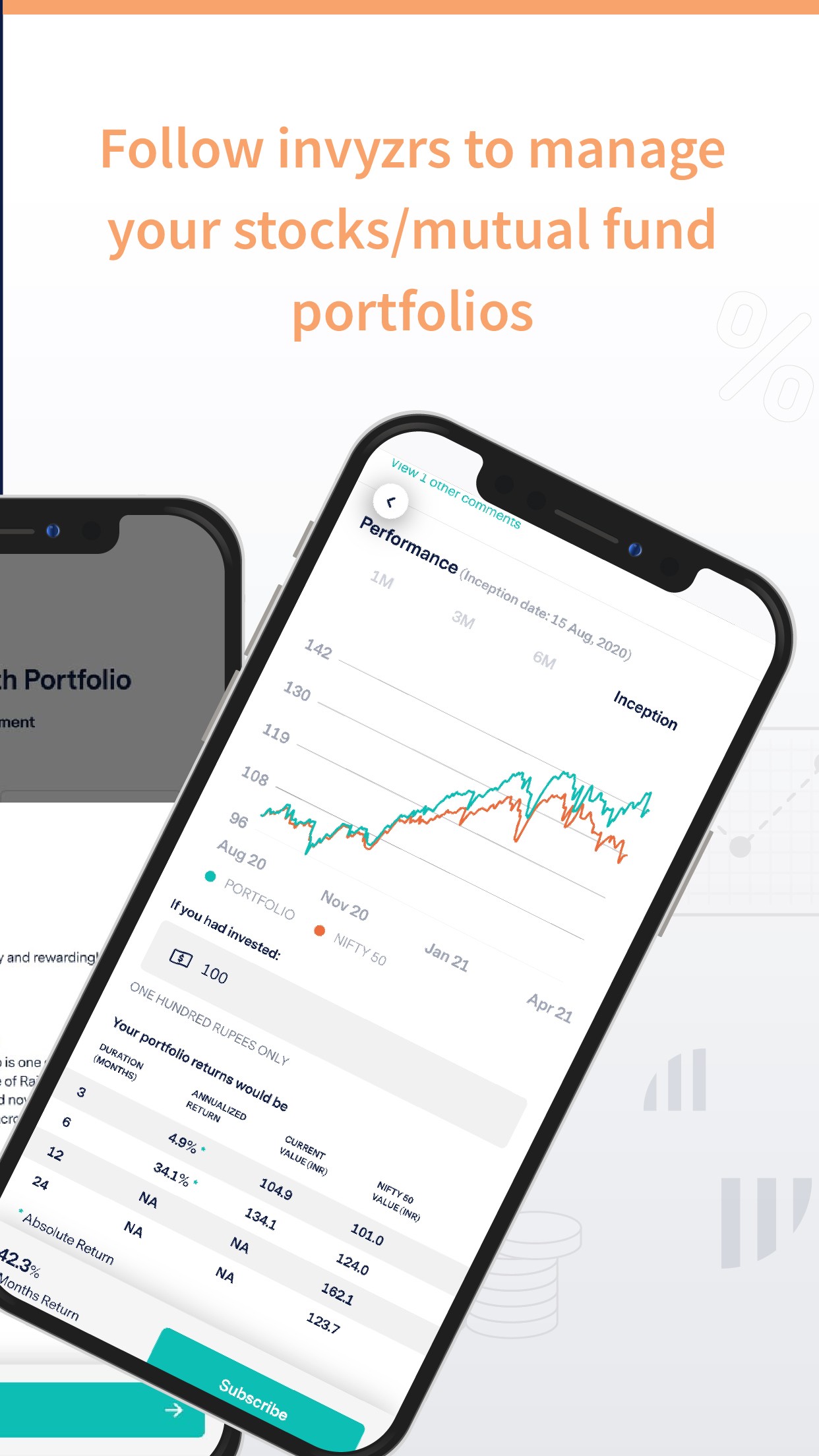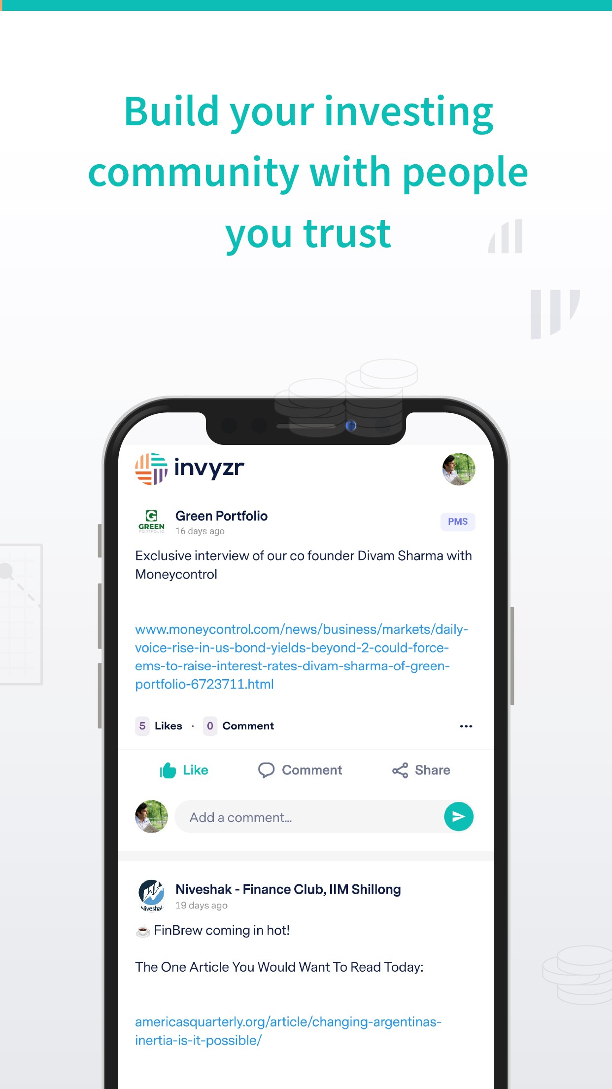 invyzr app is a social investing platform that helps you move away from Do-It-Yourself investing to professionally guided investing with help from high-quality SEBI registered investment professionals (called invyzrs). invyzr app provides retail investors with access to investment management service that is otherwise available only to the wealthy investors.