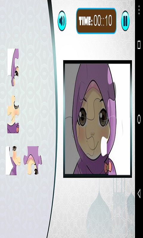 Islamic : Girl Puzzle works almost like real jigsaw puzzles for kids. Once you pick a piece it stays on the board even if you place it incorrectly, and you can nudge pieces around until it snaps to the right slot.