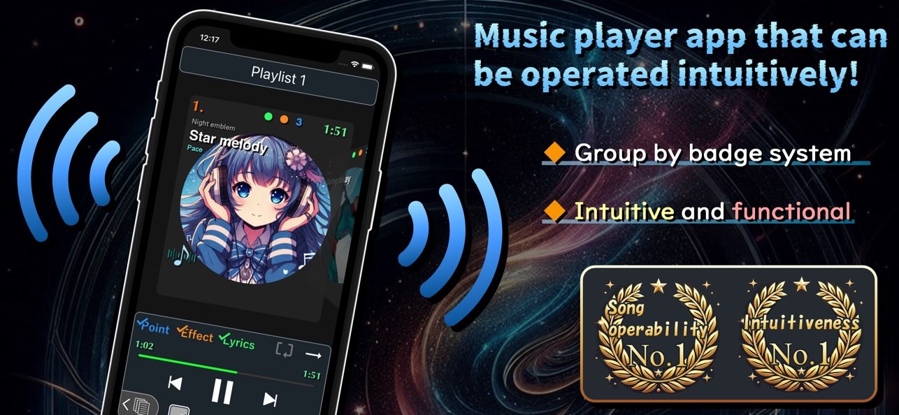 Enjoy music even more by using the innovative Badge System, effect, and point functions!
