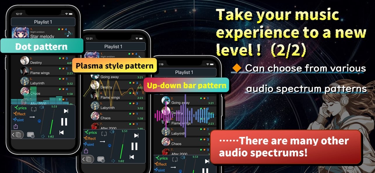 You can choose from a large number of audio spectrum, and set color settings with gradation, allowing you to arrange the music player screen to your liking!
