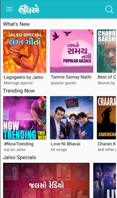With the plethora of collection from Gujarati film songs, devotional songs (Bhakti sangeet), Navratri Traditional Garba, Sugam Sangeet, and forever loved Ghazals by Ghayal, Mariz, Befam, Ramesh Parekh and many more. You get to choose your favourites from millions. Browse through Top trending songs, recently played songs or listen to audio stories as Jal-Show.