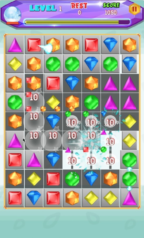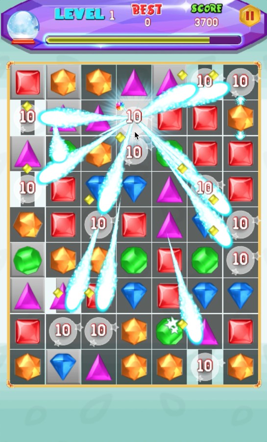 - Every match from 3 jewels you will accumulate energy for mighty bomb, that helps to destroy obstacles for you